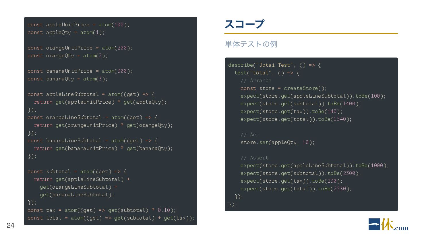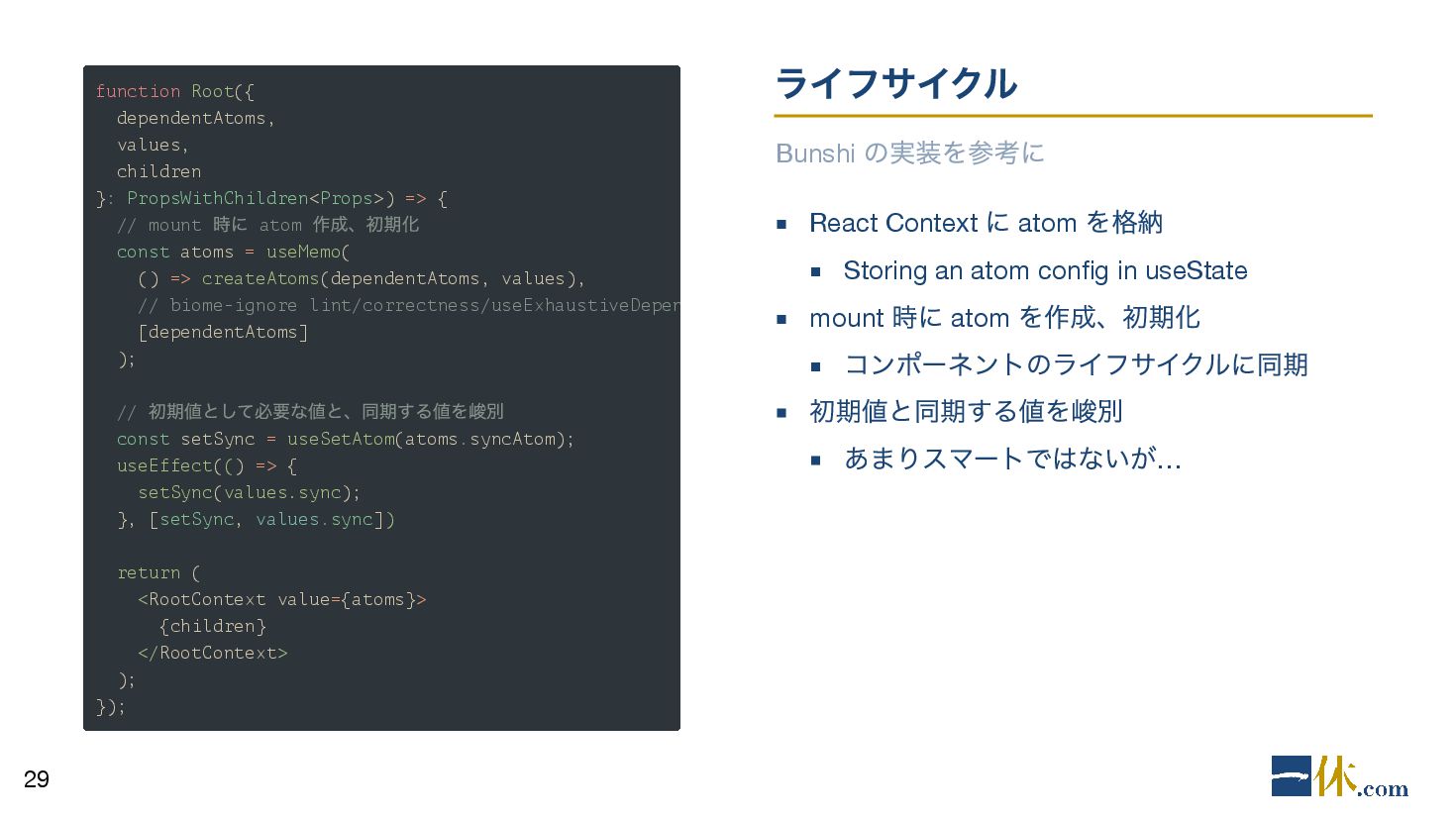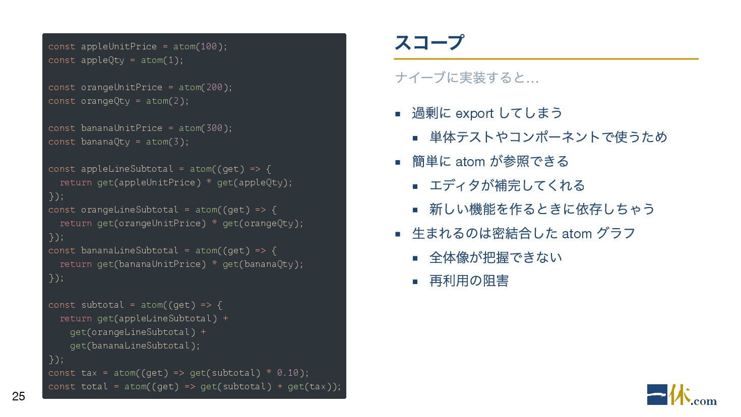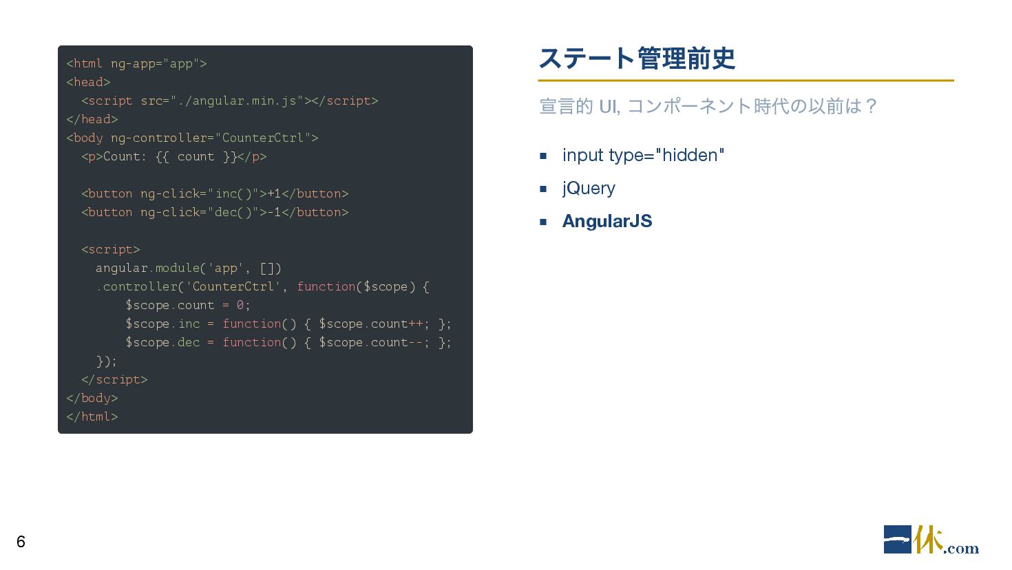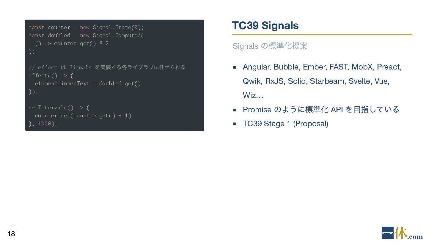 がほぼ不要) ロジックの分離・再利用 用途ごとに最適化した状態管理 SWR / React Query React Hook Form Zustand / Jotai / Valtio みえてきた課題 セマンティクスが複雑化 function Counter() { const { count, inc, dec } = useCounter(); return ( <div> <p>Count: {count}</p> <button onClick={inc}>+1</button> <button onClick={dec}>-1</button> </div> ); } function useCounter() { const [count, setCount] = useState(0); const inc = useCallback(() => { setCount(c => c + 1); }, []); const dec = useCallback(() => { setCount(c => c - 1); }, []); return { count, inc, dec }; } Functional Component の登場