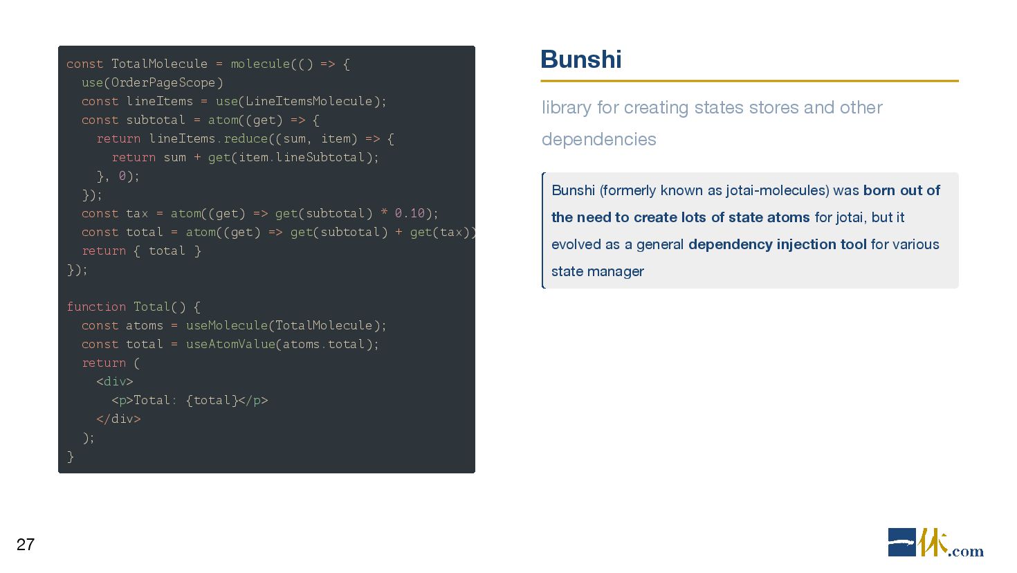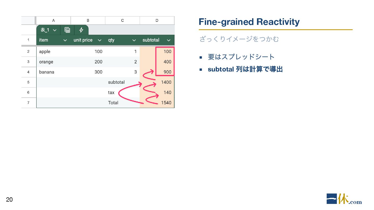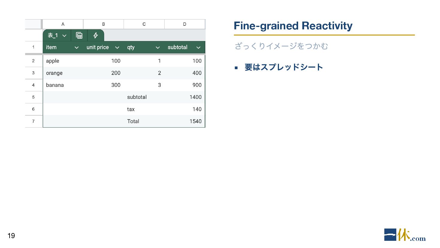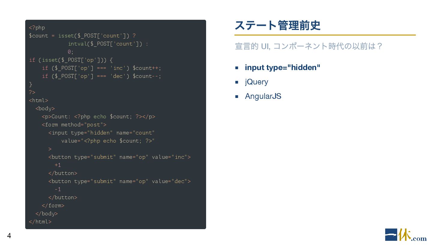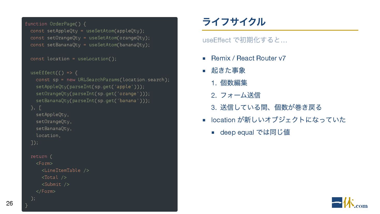 がほぼ不要) ロジックの分離・再利用 用途ごとに最適化した状態管理 SWR / React Query React Hook Form Zustand / Jotai / Valtio みえてきた課題 セマンティクスが複雑化 function Counter() { const { count, inc, dec } = useCounter(); return ( <div> <p>Count: {count}</p> <button onClick={inc}>+1</button> <button onClick={dec}>-1</button> </div> ); } function useCounter() { const [count, setCount] = useState(0); const inc = useCallback(() => { setCount(c => c + 1); }, []); const dec = useCallback(() => { setCount(c => c - 1); }, []); return { count, inc, dec }; } Functional Component の登場