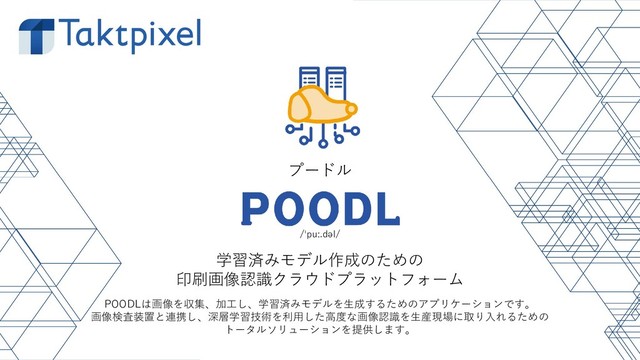 POODLは深層学習の学習済みモデル作成のための印刷画像認識クラウドプラットフォームです。画像を収集、加工し、学習済みモデルを生成します。画像検査装置と連携し、深層学習技術を利用した高度な画像認識を生産現場に取り入れるためのトータルソリューションを提供します。 https://poodl.cloud/
