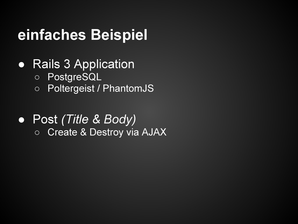 einfaches Beispiel • Rails 3 Application ◦ PostgreSQL ◦ Poltergeist