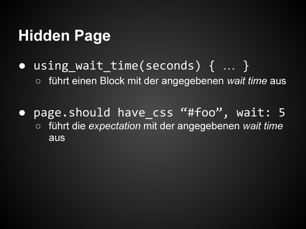 Hidden Page • using_wait_time(seconds) { … } ◦ führt einen