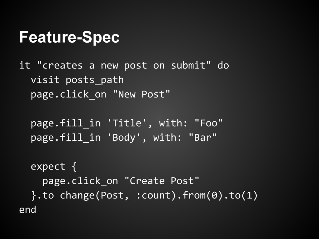 posts_path page.click_on "New Post" page.fill_in 'Title', with: "Foo" page.fill_in 'Body', with: "Bar" expect { page.click_on "Create Post" }.to change(Post, :count).from(0).to(1) end