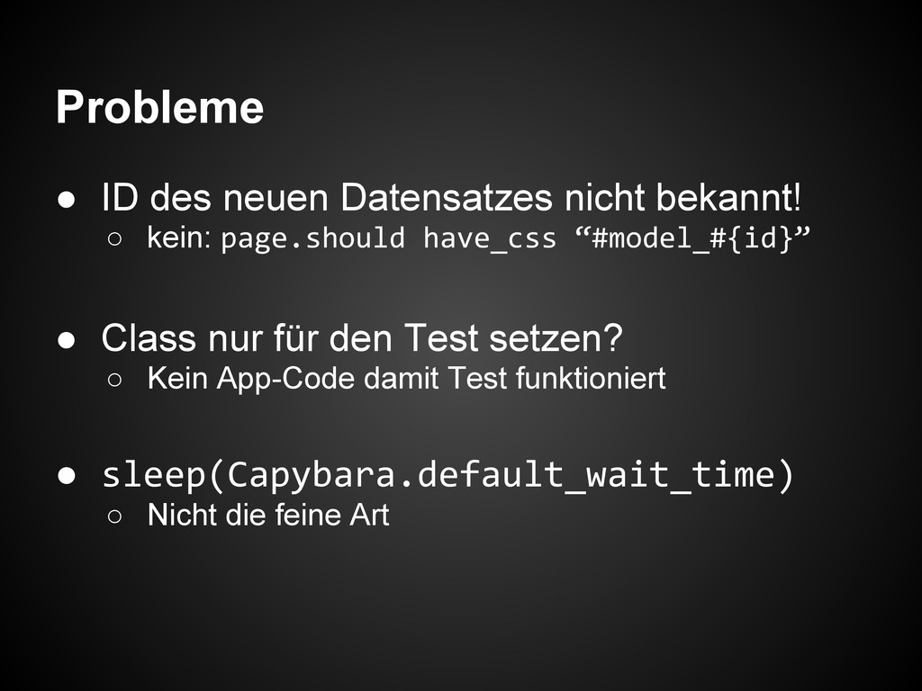 page.should have_css “#model_#{id}” • Class nur für den Test setzen? ◦ Kein App-Code damit Test funktioniert • sleep(Capybara.default_wait_time) ◦ Nicht die feine Art
