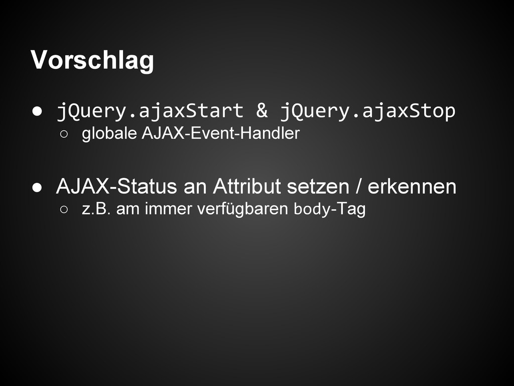 Vorschlag • jQuery.ajaxStart & jQuery.ajaxStop ◦ globale AJAX-Event-Handler • AJAX-Status