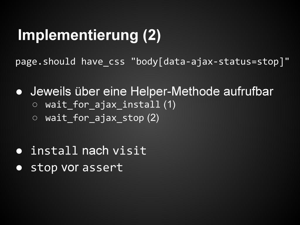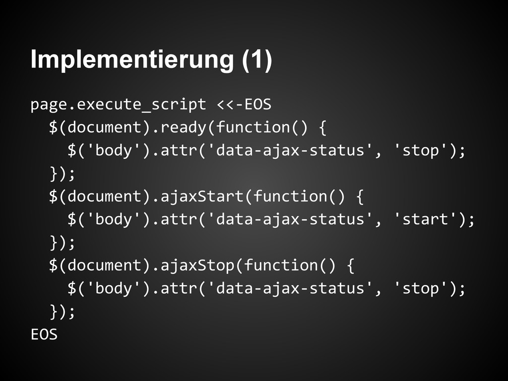 Implementierung (1) page.execute_script <<-EOS $(document).ready(function() { $('body').attr('data-ajax-status', 'stop'); }); $(document).ajaxStart(function()
