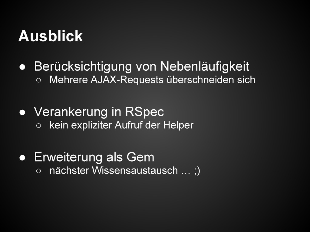 • Verankerung in RSpec ◦ kein expliziter Aufruf der Helper • Erweiterung als Gem ◦ nächster Wissensaustausch … ;)