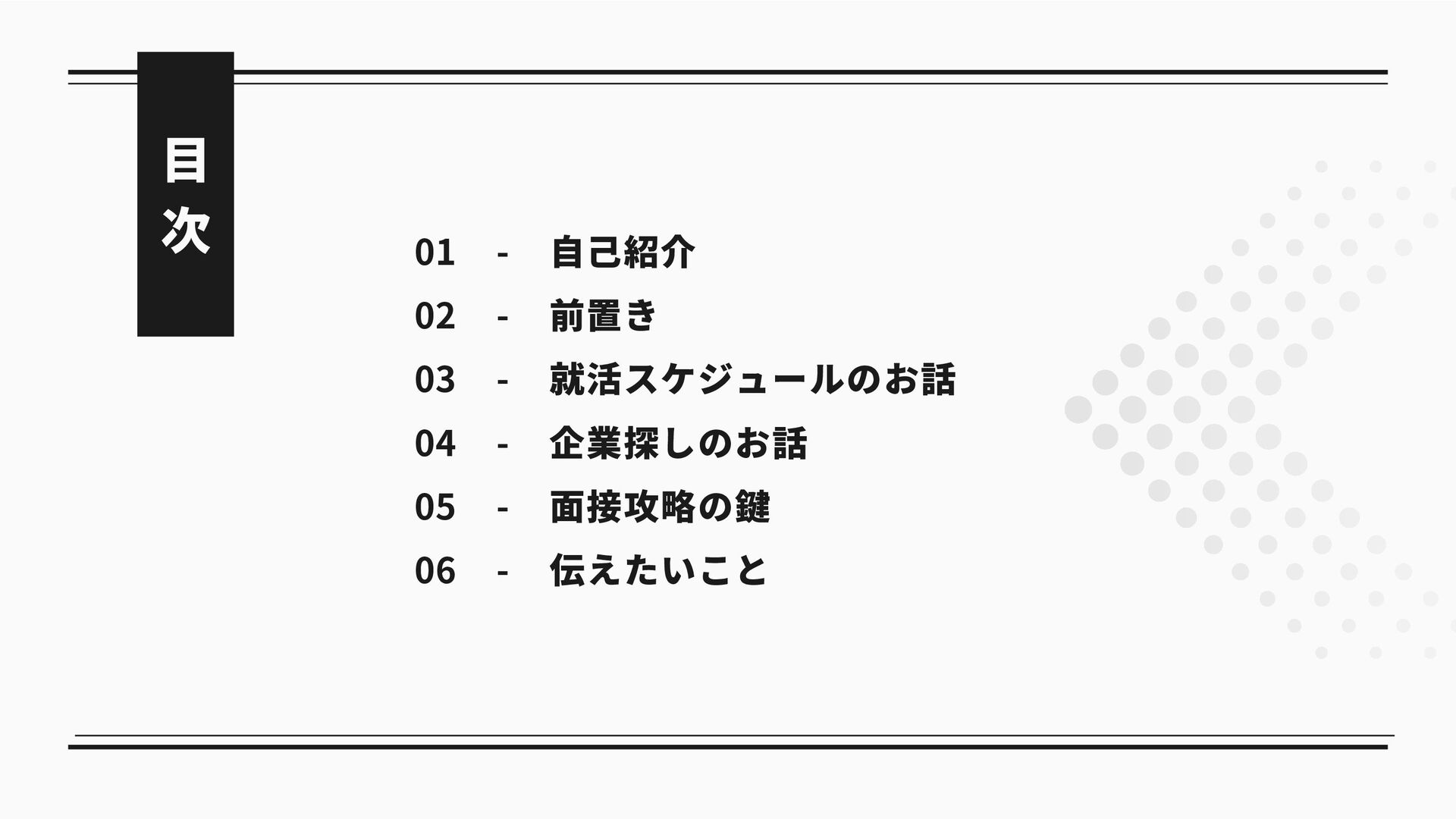 自己紹介 前置き 就活スケジュールのお話 企業探しのお話 面接攻略の鍵 伝えたいこと 01 02 03 04