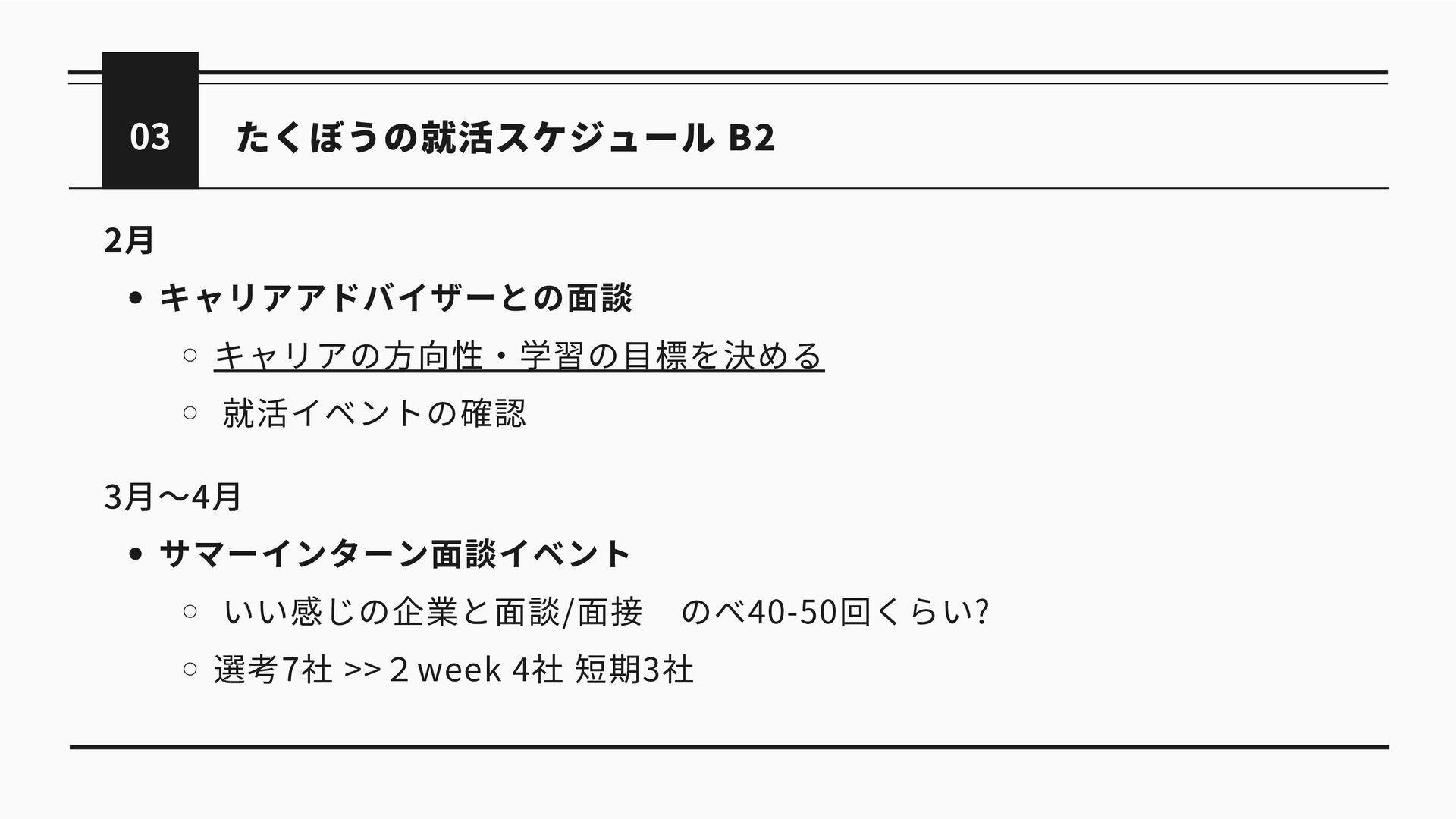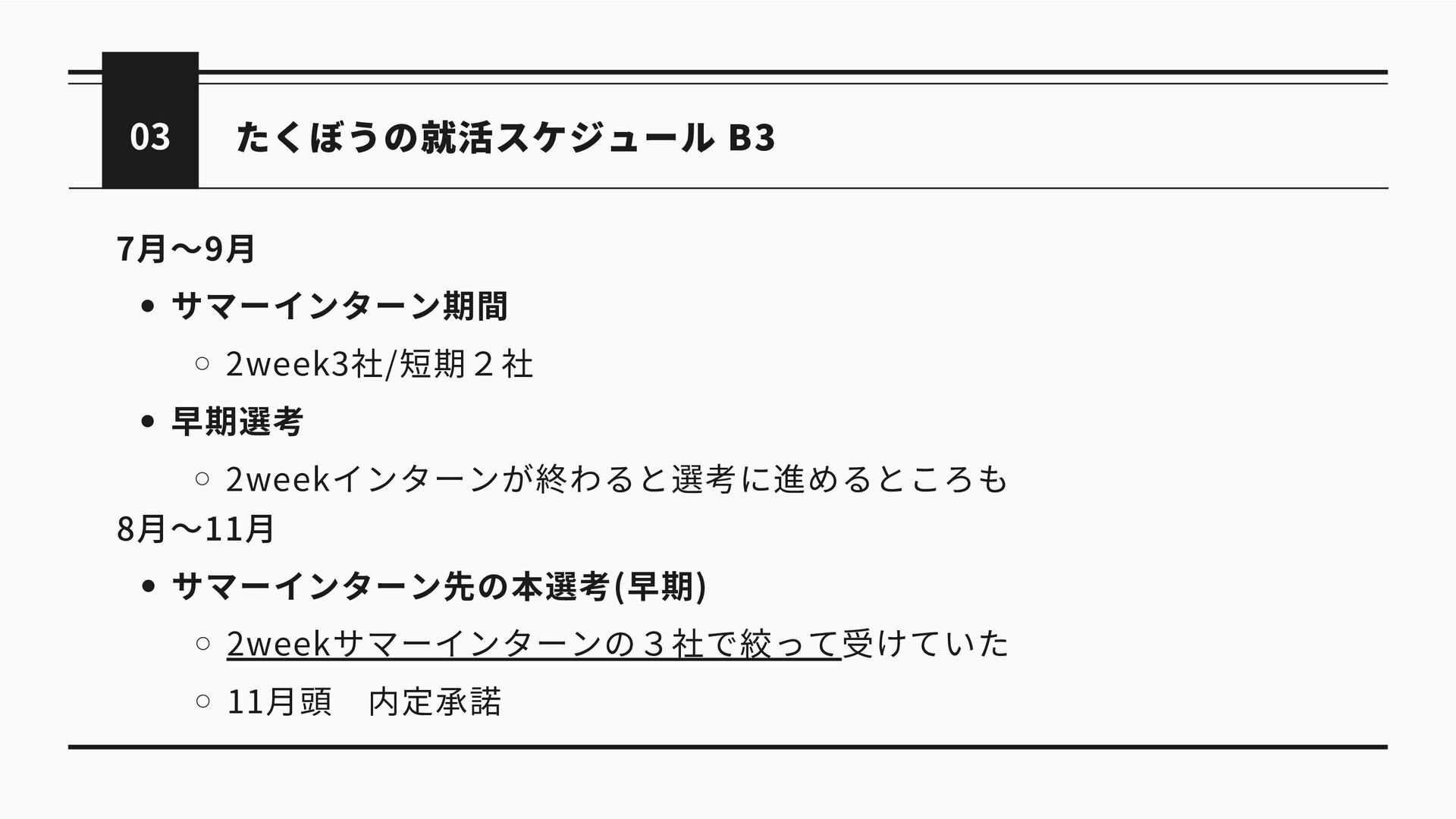 たくぼうの就活スケジュール B3 03 7月〜9月 サマーインターン期間 2week3社/短期2社 早期選考 2weekインターンが終わると選考に進めるところも 8月〜11月 サマーインターン先の本選考(早期)