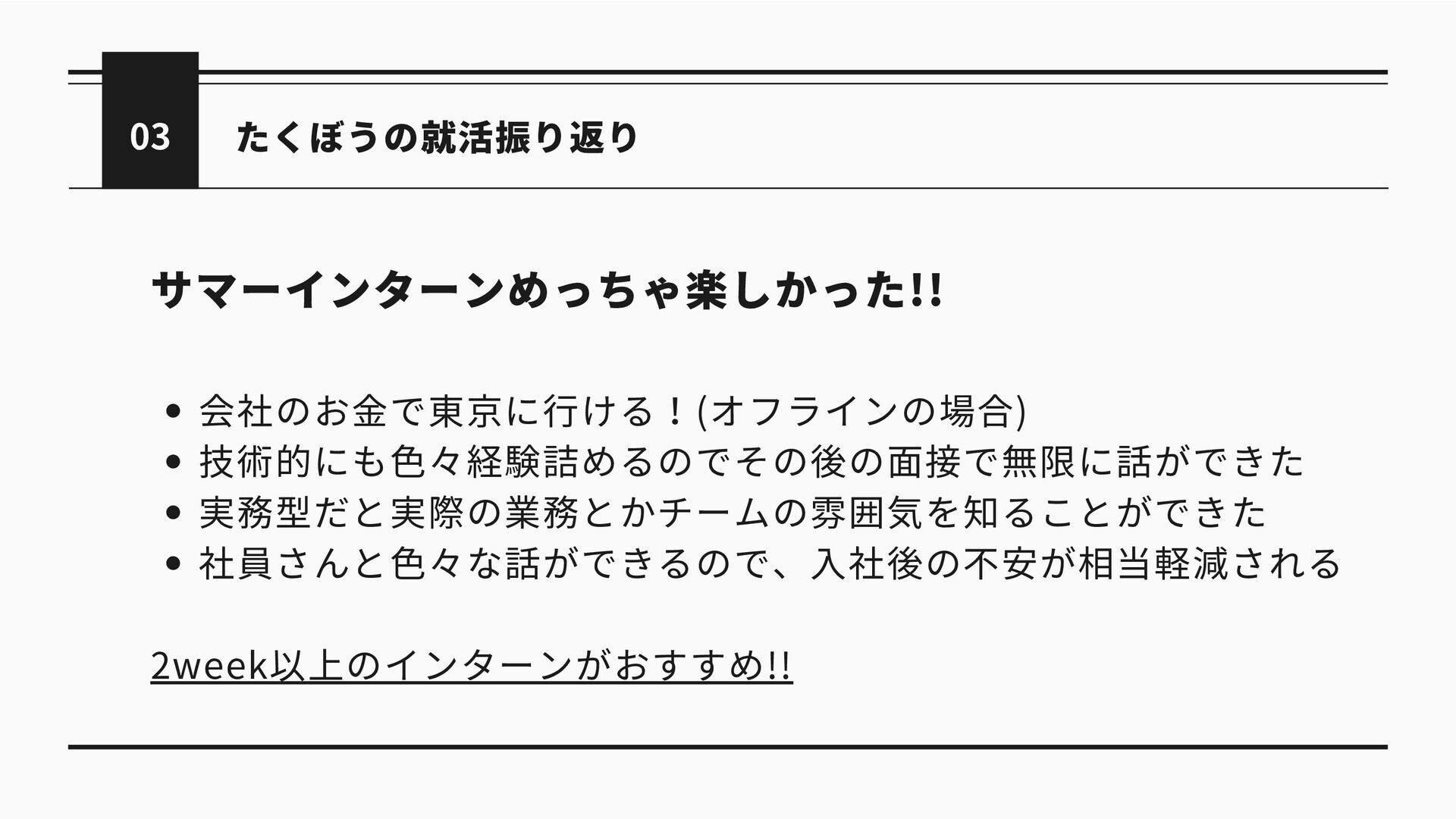 たくぼうの就活振り返り 03 サマーインターンめっちゃ楽しかった!! 会社のお金で東京に行ける!(オフラインの場合) 技術的にも色々経験詰めるのでその後の面接で無限に話ができた 実務型だと実際の業務とかチームの雰囲気を知ることができた 社員さんと色々な話ができるので、入社後の不安が相当軽減される 2week以上のインターンがおすすめ!!