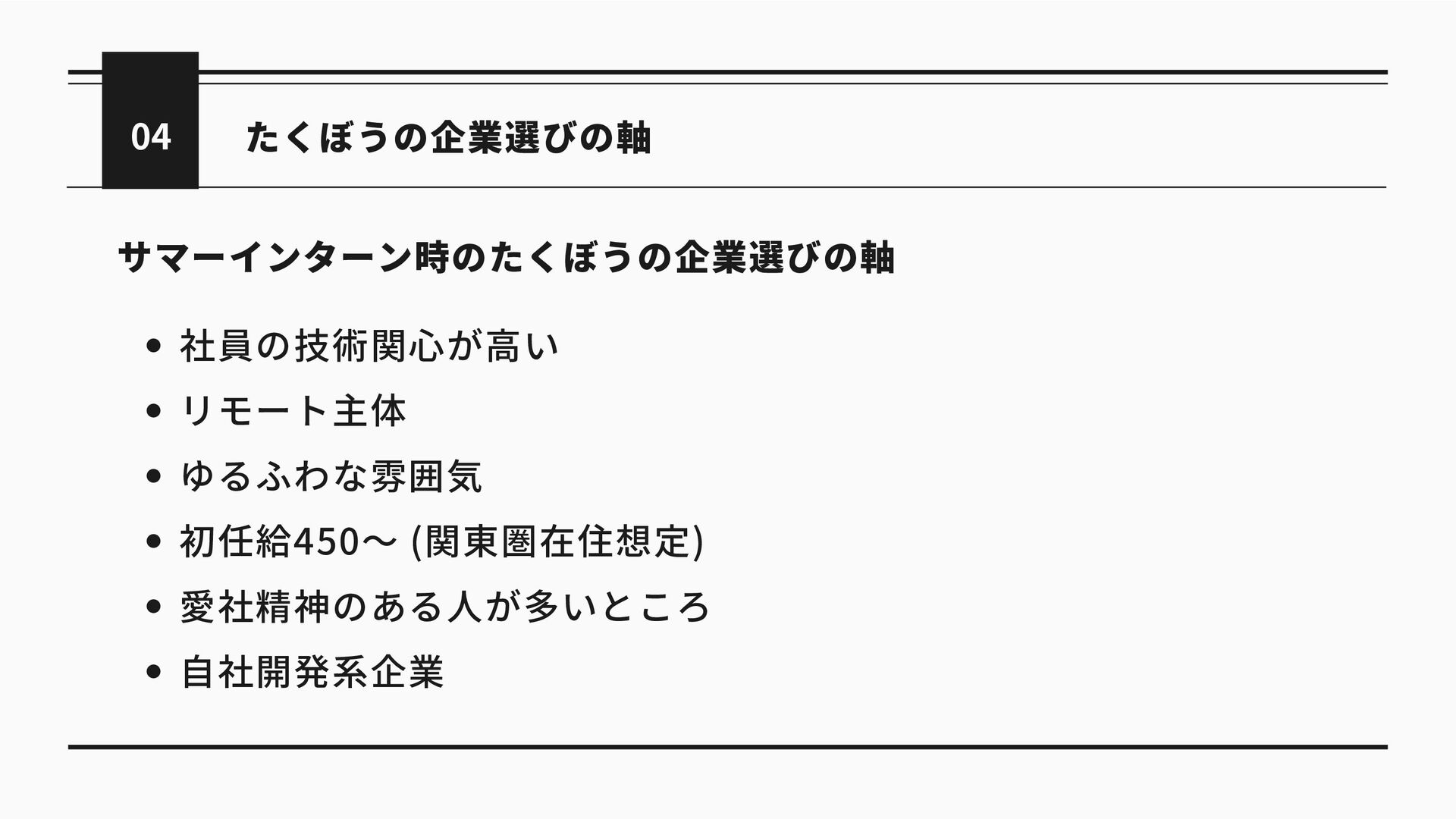 たくぼうの企業選びの軸 04 社員の技術関心が高い リモート主体 ゆるふわな雰囲気 初任給450〜 (関東圏在住想定) 愛社精神のある人が多いところ 自社開発系企業 サマーインターン時のたくぼうの企業選びの軸