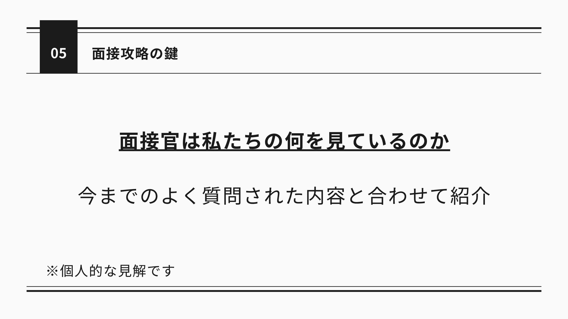 05 面接攻略の鍵 面接官は私たちの何を見ているのか 今までのよく質問された内容と合わせて紹介 ※個人的な見解です