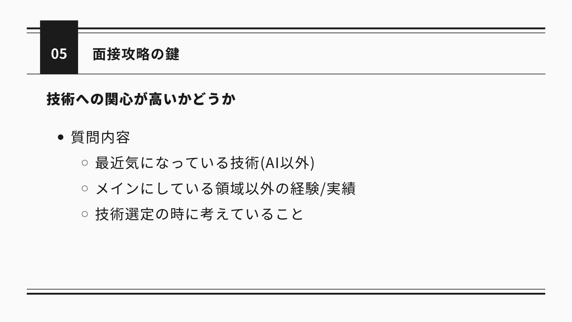 05 面接攻略の鍵 技術への関心が高いかどうか 質問内容 最近気になっている技術(AI以外) メインにしている領域以外の経験/実績 技術選定の時に考えていること