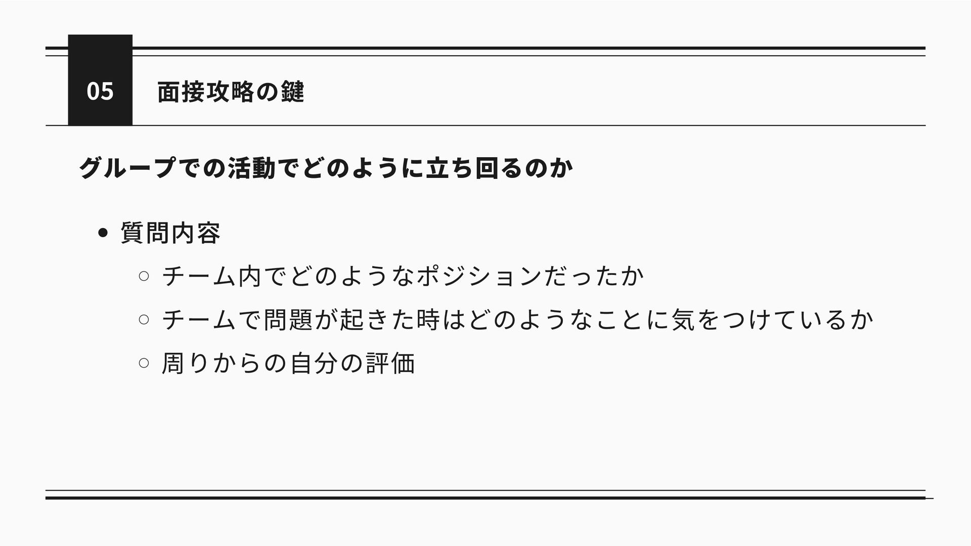 05 面接攻略の鍵 グループでの活動でどのように立ち回るのか 質問内容 チーム内でどのようなポジションだったか チームで問題が起きた時はどのようなことに気をつけているか 周りからの自分の評価