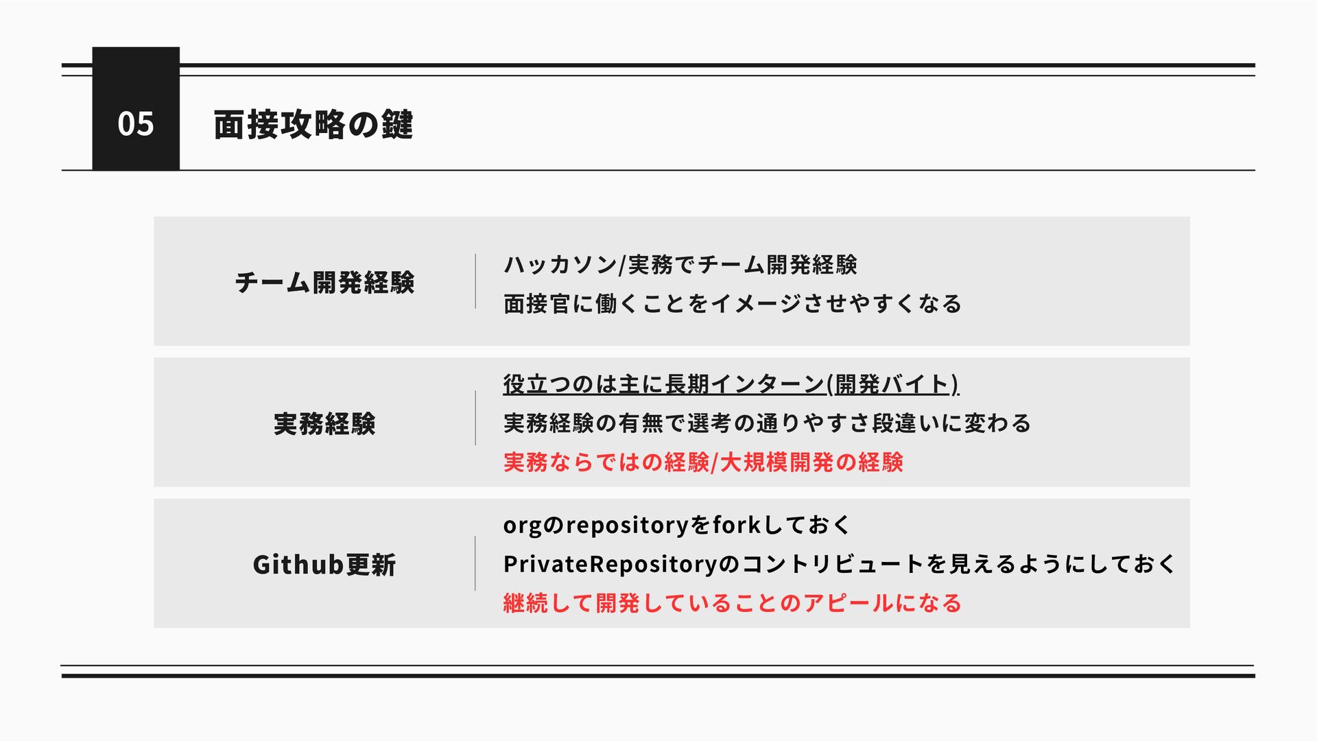 面接攻略の鍵 05 チーム開発経験 ハッカソン/実務でチーム開発経験 面接官に働くことをイメージさせやすくなる 実務経験 役立つのは主に長期インターン(開発バイト) 実務経験の有無で選考の通りやすさ段違いに変わる 実務ならではの経験/大規模開発の経験 Github更新