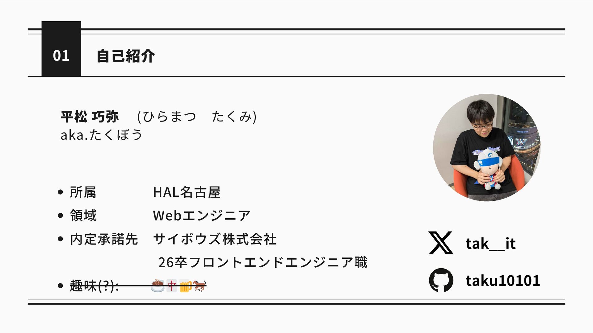 自己紹介 01 平松 巧弥 (ひらまつ たくみ) aka.たくぼう 所属 HAL名古屋 領域 Webエンジニア 内定承諾先 サイボウズ株式会社 26卒フロントエンドエンジニア職