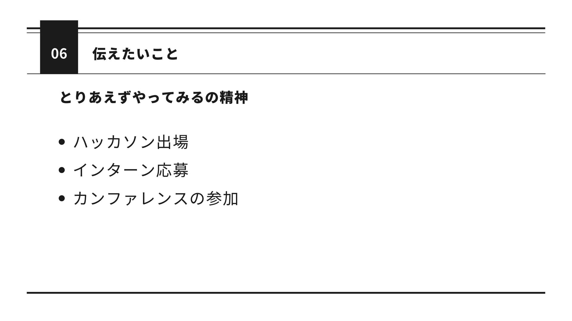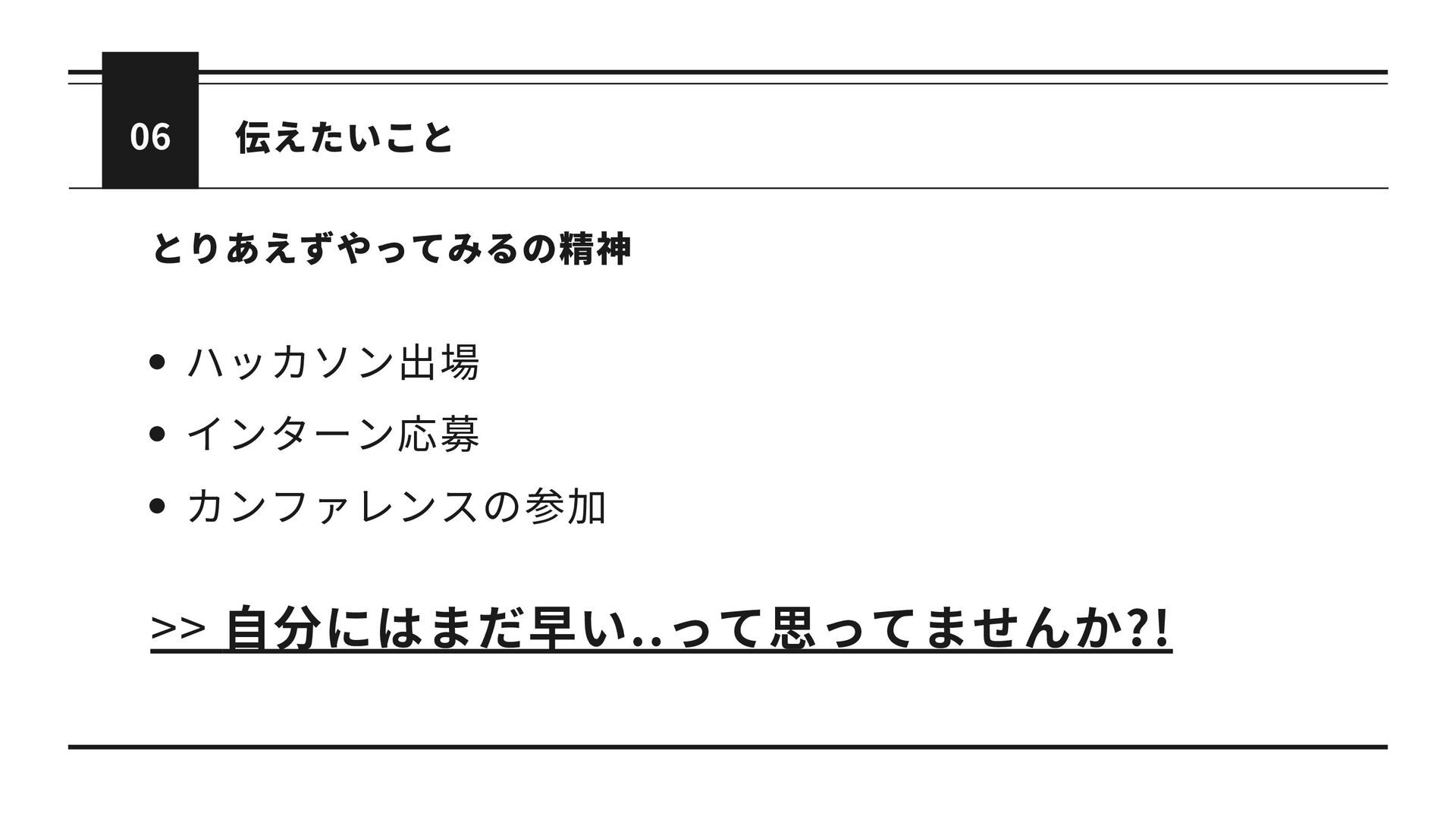 06 とりあえずやってみるの精神 ハッカソン出場 インターン応募 カンファレンスの参加 伝えたいこと
