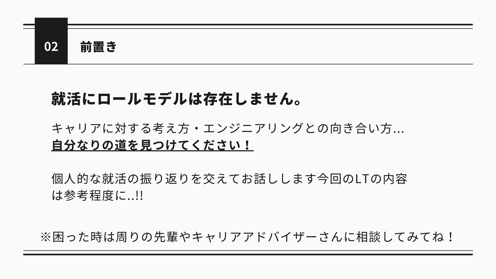 前置き 02 就活にロールモデルは存在しません。 キャリアに対する考え方・エンジニアリングとの向き合い方... 自分なりの道を見つけてください! 個人的な就活の振り返りを交えてお話しします今回のLTの内容 は参考程度に..!! ※困った時は周りの先輩やキャリアアドバイザーさんに相談してみてね!