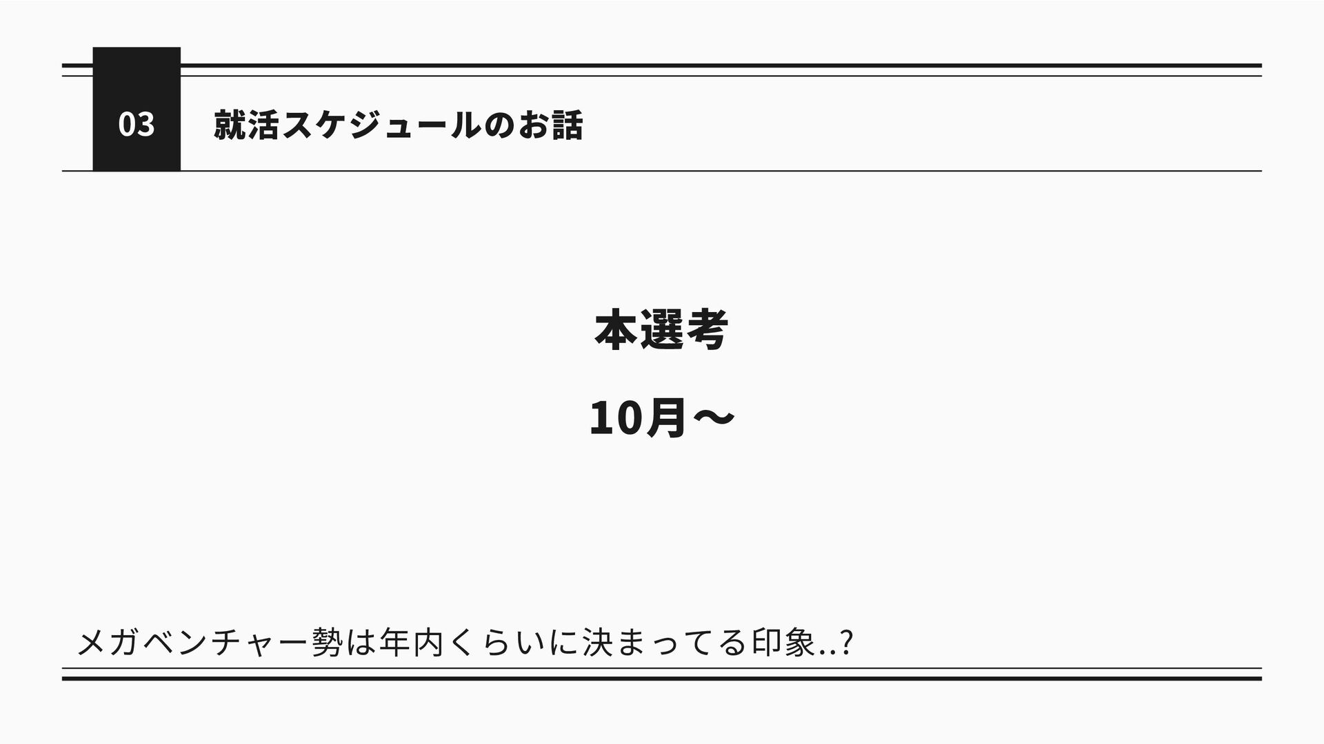 就活スケジュールのお話 03 本選考 10月〜 メガベンチャー勢は年内くらいに決まってる印象..?