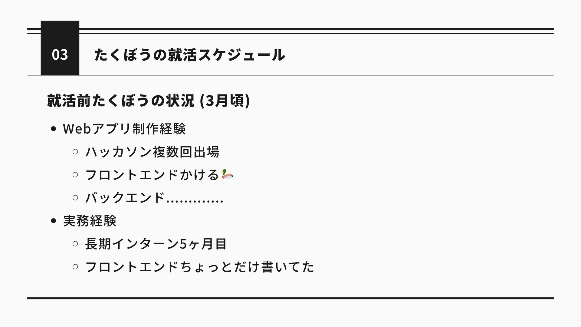 たくぼうの就活スケジュール 03 就活前たくぼうの状況 (3月頃) Webアプリ制作経験 ハッカソン複数回出場 フロントエンドかける 🦆 バックエンド............. 実務経験