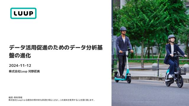 機密・専有情報 株式会社Luupによる個別の明示的な承諾を得ることなく、この資料を使用することを固く禁じます。 データ活用促進のためのデータ分析基 盤の進化 株式会社Luup 河野匠真 2024-11-12