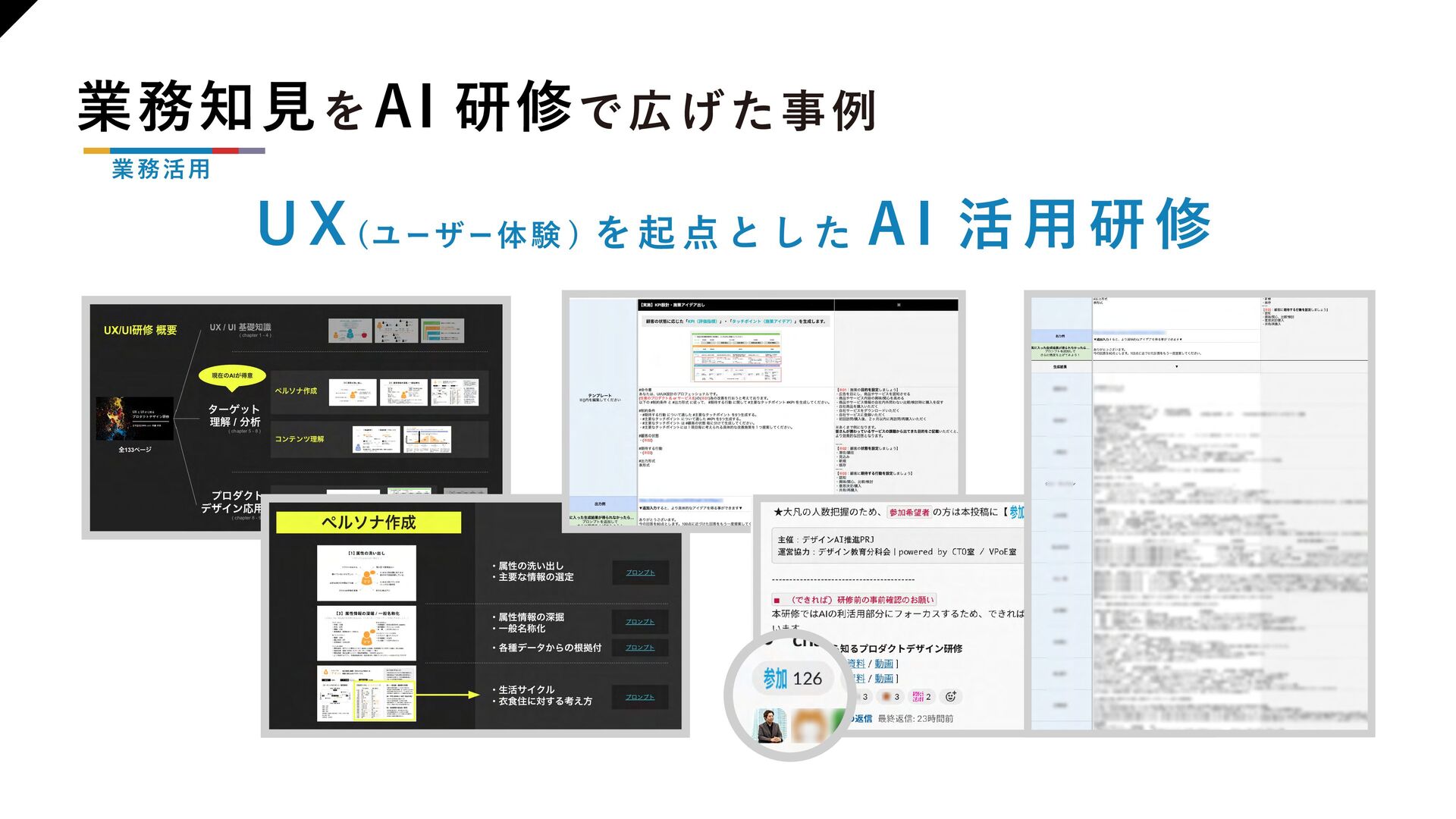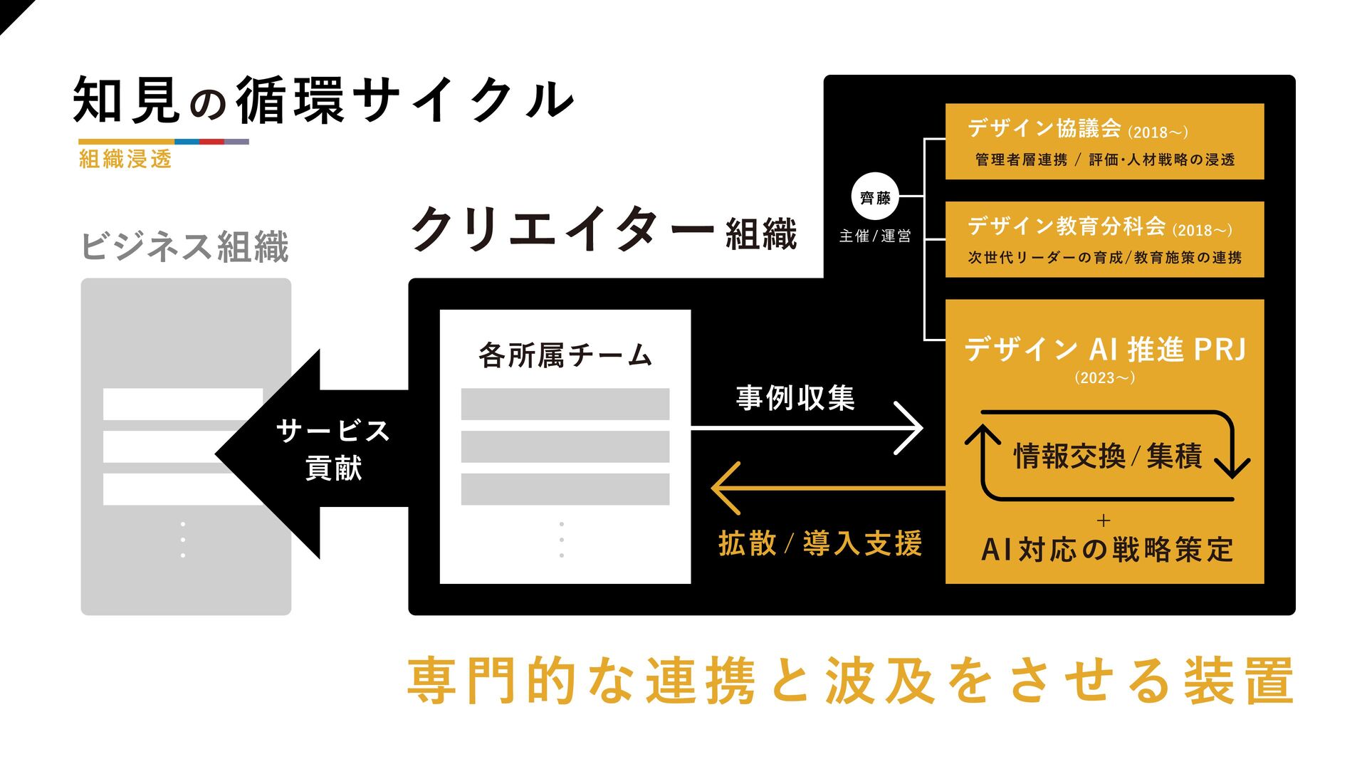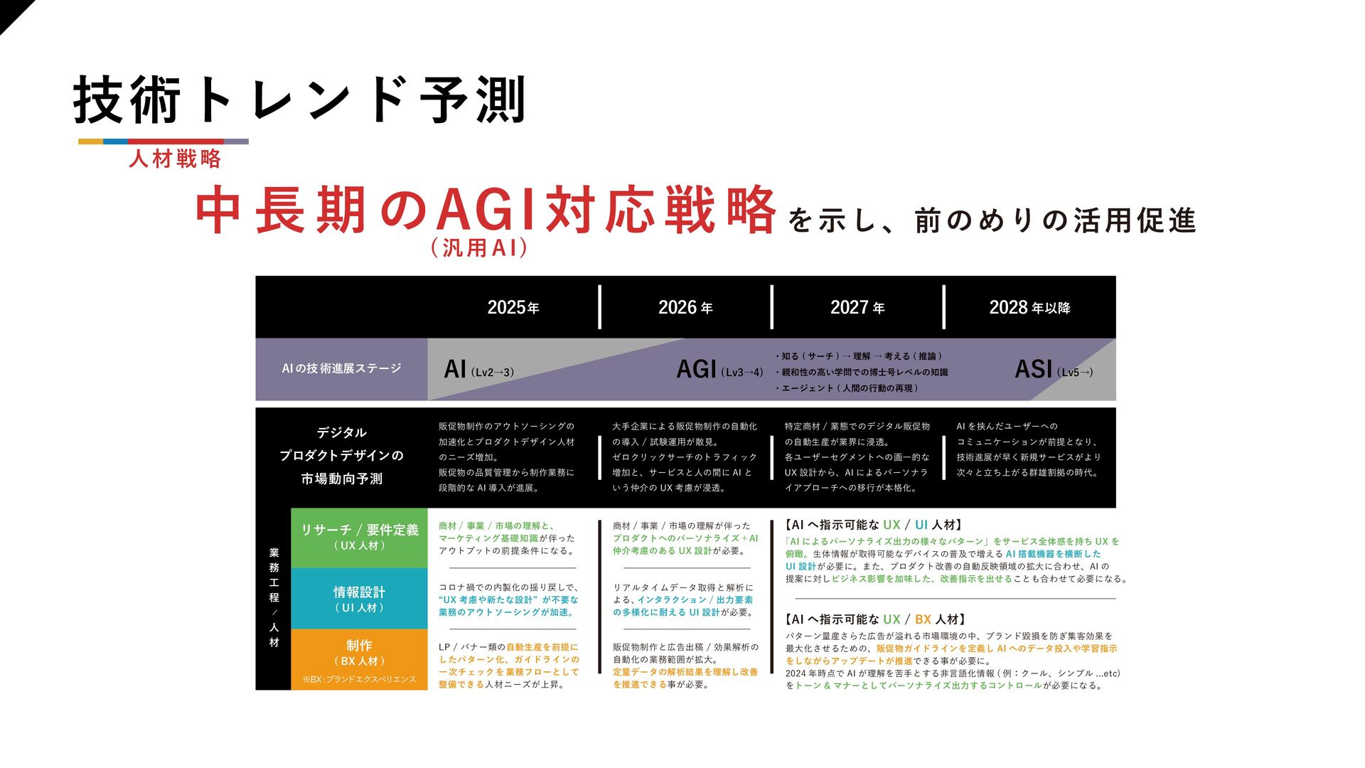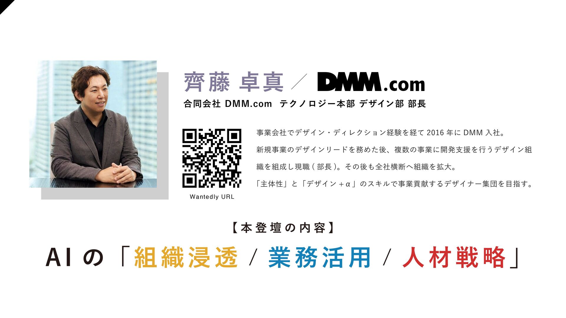 【組織浸透】 ・DMM デザイナーの 指針 ・推進の枠組み ・知見の循環サイクル 【業務活用】 ・活用事例の拡散 ・業務知見をAI 研修で広げた事例 ・新たに生まれた優良事例を教材として拡散 ・在籍デザイナーのAI活用状況 【人材戦略】 ・技術トレンド予測 ・AGI の進化で広がる可能性 ・商売とより広く繋がるための準備