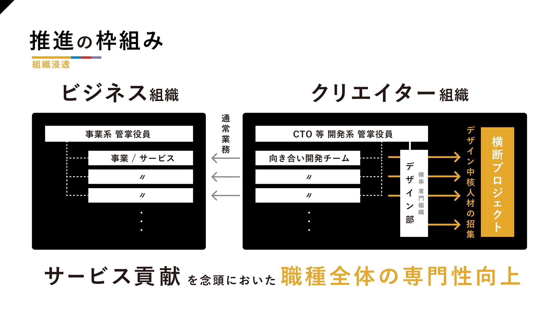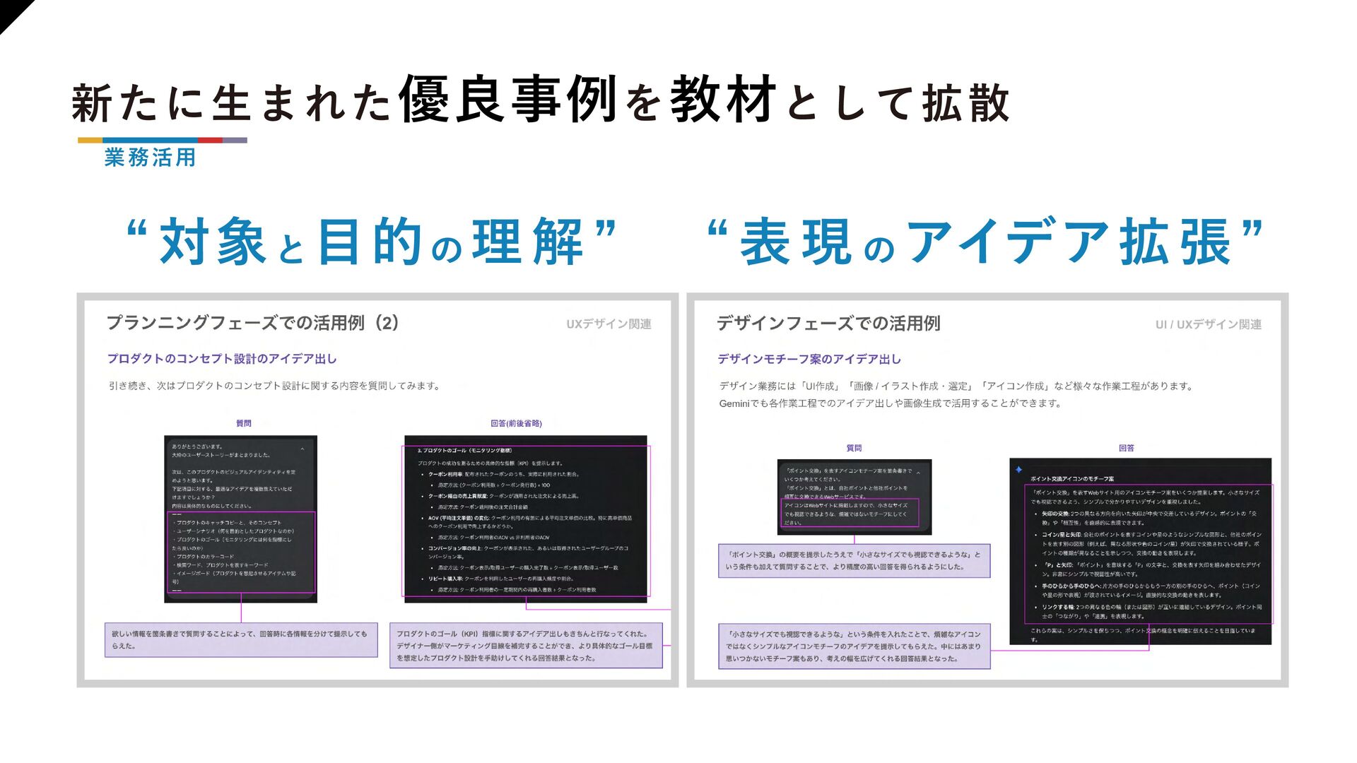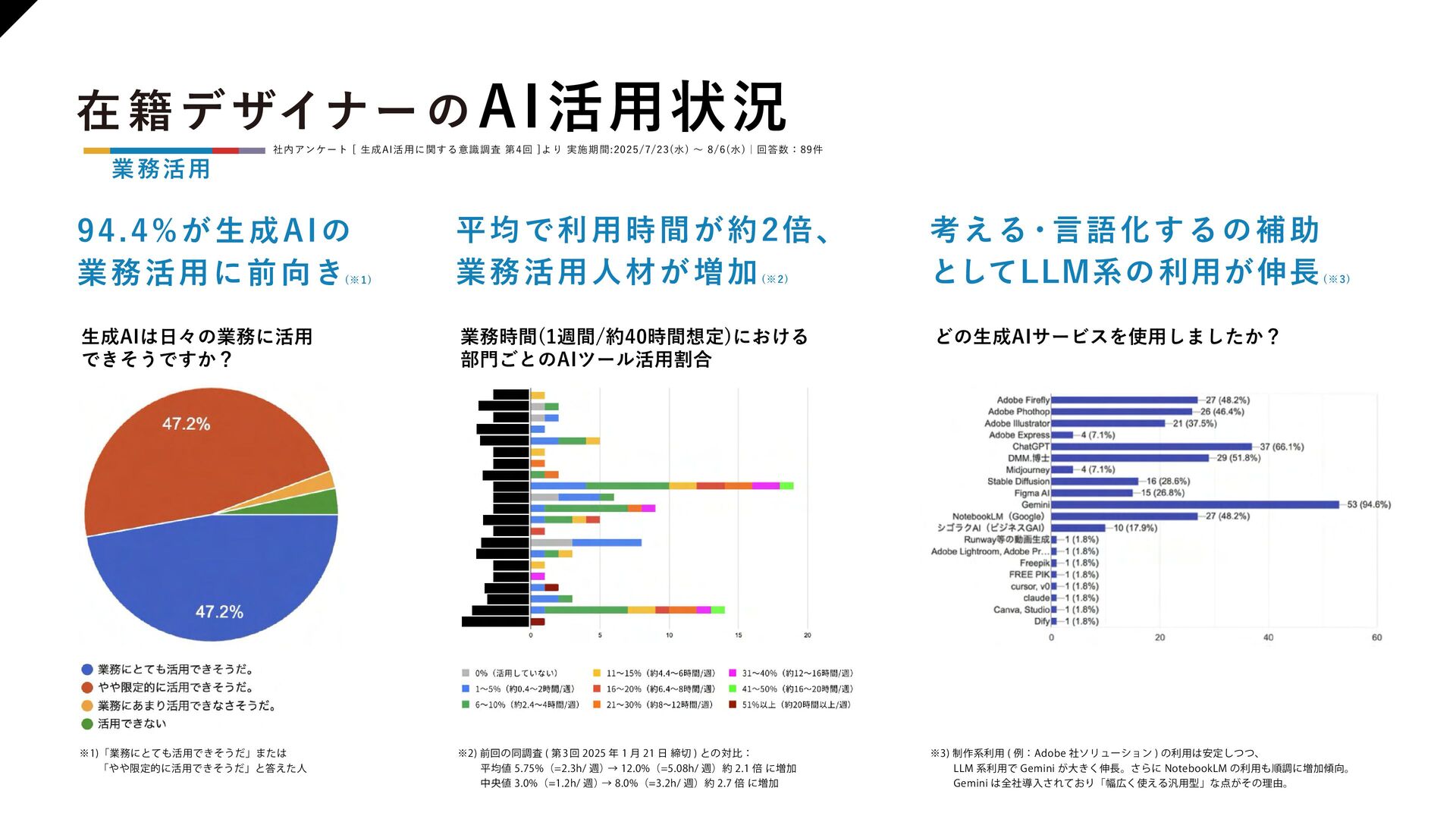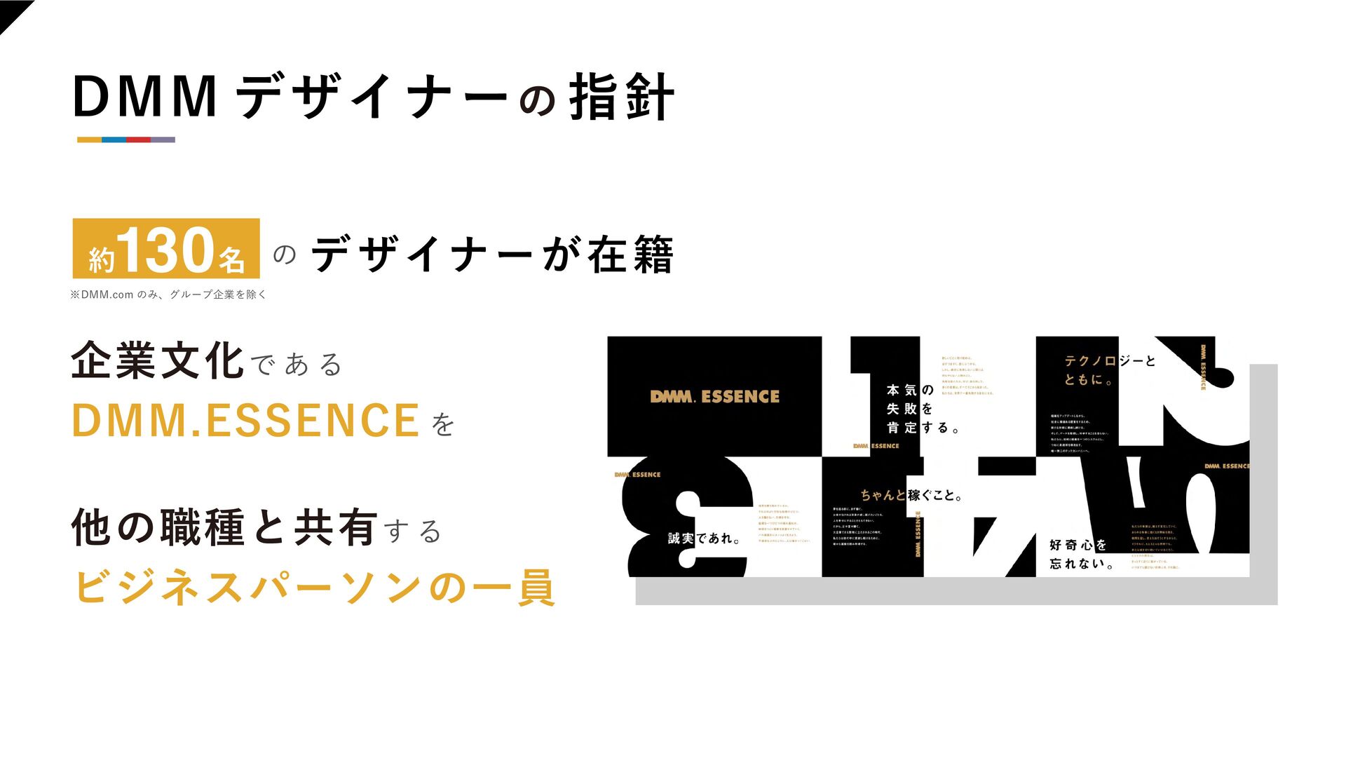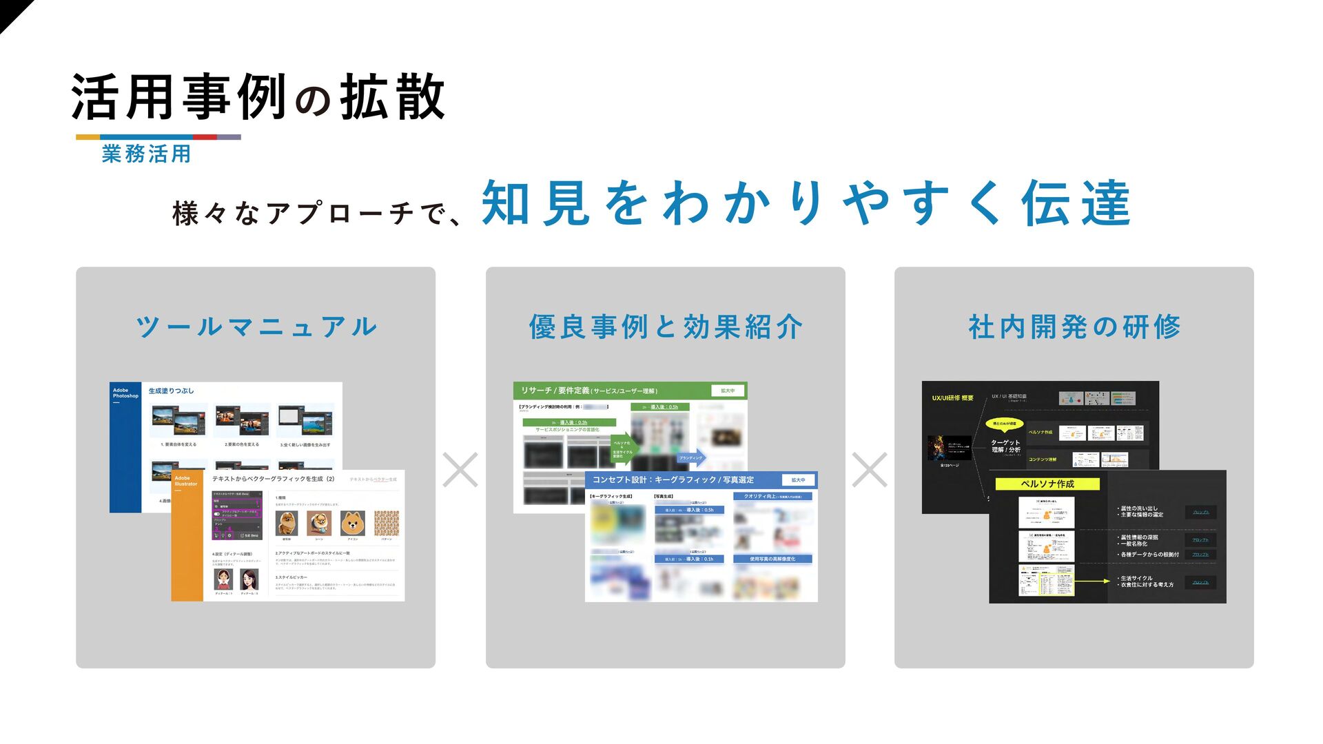 【組織浸透】 ・DMM デザイナーの 指針 ・推進の枠組み ・知見の循環サイクル 【業務活用】 ・活用事例の拡散 ・業務知見をAI 研修で広げた事例 ・新たに生まれた優良事例を教材として拡散 ・在籍デザイナーのAI活用状況 【人材戦略】 ・技術トレンド予測 ・AGI の進化で広がる可能性 ・商売とより広く繋がるための準備
