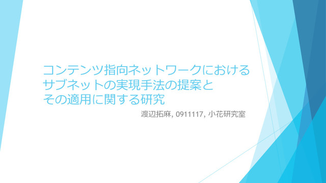 コンテンツ指向ネットワークにおける サブネットの実現⼿手法の提案と その適⽤用に関する研究 渡辺拓拓⿇麻, 0911117, ⼩小花研究室