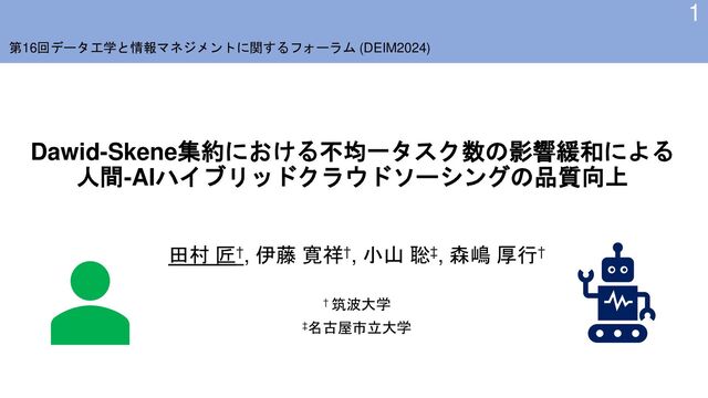 [7] これらはタスク割り当て手法について議論しており, 結果集約については議論されていない 混在状況における結果集約についてはTamuraらがAIワーカの出力する不 確実性を集約に利用することで品質向上が可能になることを報告 [8] タスク数不均一の問題については考慮していない [6] Masaki Kobayashi, Kei Wakabayashi, and Atsuyuki Morishima. Human+AI crowd task assignment considering result quality requirements. In Proceedings of the AAAI Conference on Human Computation and Crowdsourcing (HCOMP), Vol. 9, pp. 97–107, 2021. [7] Tomoya Kanda, Hiroyoshi Ito, and Atsuyuki Morishima. Efficient evaluation of AI workers for the human+AI crowd task assignment. In Proceedings of IEEE International Conference on Big Data (BigData), pp. 3995–4001, 2022. [8] Takumi Tamura, Hiroyoshi Ito, Satoshi Oyama, and Atsuyuki Morishima. Influence of AI’s uncertainty in the Dawid-Skene aggregation for human-AI crowdsourcing. In Information for a Better World: Wisdom, Well-being, Win-win, 19th International Conference on Information (iConference 2024), in press.