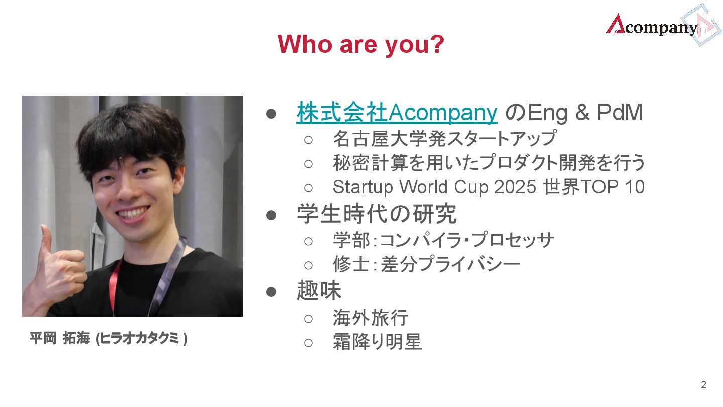 ◦ 秘密計算を用いたプロダクト開発を行う ◦ Startup World Cup 2025 世界TOP 10 • 学生時代の研究 ◦ 学部:コンパイラ・プロセッサ ◦ 修士:差分プライバシー • 趣味 ◦ 海外旅行 ◦ 霜降り明星 平岡 拓海 (ヒラオカタクミ ) 2