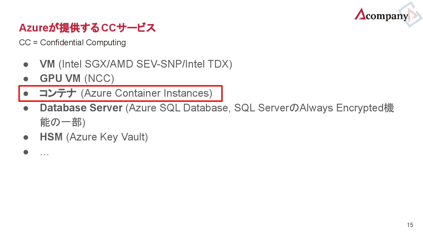 • コンテナ (Azure Container Instances) • Database Server (Azure SQL Database, SQL ServerのAlways Encrypted機 能の一部) • HSM (Azure Key Vault) • … Azureが提供する CCサービス CC = Confidential Computing 14