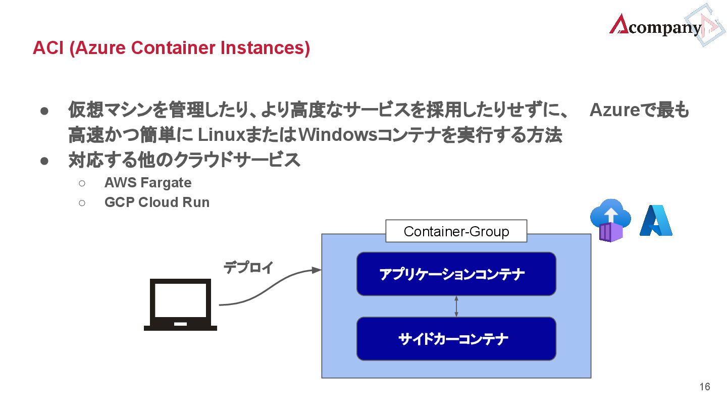 • 仮想マシンを管理したり、より高度なサービスを採用したりせずに、 Azureで最も 高速かつ簡単に LinuxまたはWindowsコンテナを実行する方法 • 対応する他のクラウドサービス ◦ AWS Fargate