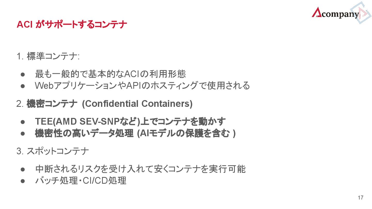 • TEE(AMD SEV-SNPなど)上でコンテナを動かす • 機密性の高いデータ処理 (AIモデルの保護を含む ) 3. スポットコンテナ • 中断されるリスクを受け入れて安くコンテナを実行可能 • バッチ処理・CI/CD処理 ACI がサポートするコンテナ 17