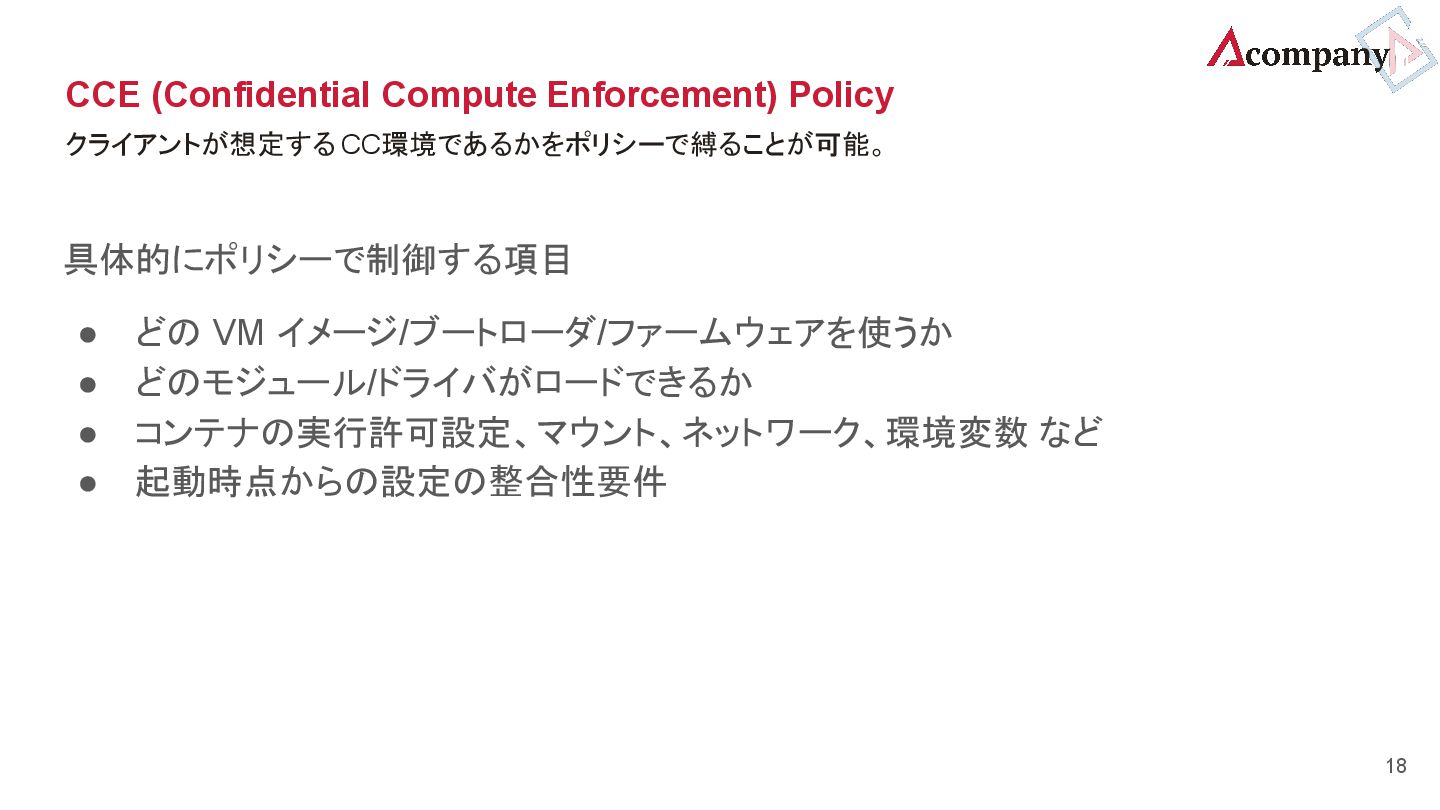 • 起動時点からの設定の整合性要件 CCE (Confidential Compute Enforcement) Policy クライアントが想定する CC環境であるかをポリシーで縛ることが可能。 18