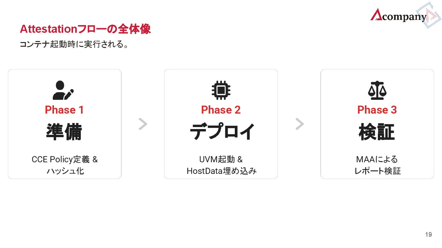 デプロイ UVM起動 & HostData埋め込み Phase 3 検証 MAAによる レポート検証 コンテナ起動時に実行される。 19