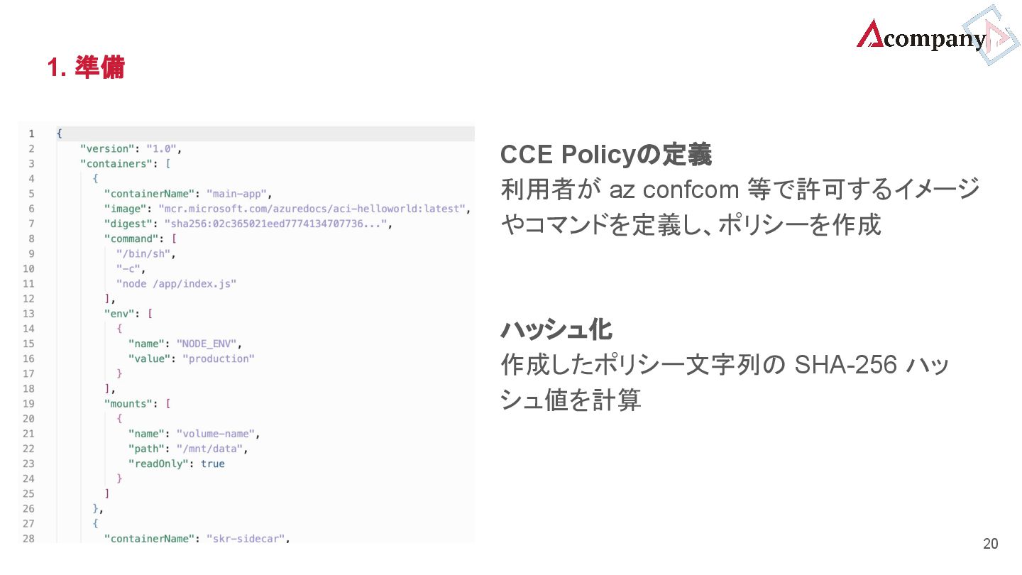 CCE Policyの定義 利用者が az confcom 等で許可するイメージ やコマンドを定義し、ポリシーを作成 ハッシュ化 作成したポリシー文字列の SHA-256