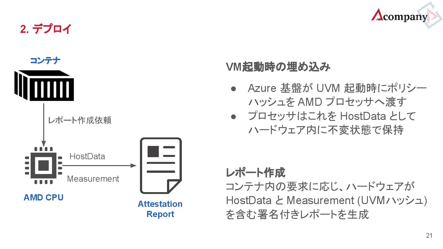 プロセッサはこれを HostData として ハードウェア内に不変状態で保持 レポート作成 コンテナ内の要求に応じ、ハードウェアが HostData と Measurement (UVMハッシュ) を含む署名付きレポートを生成 2. デプロイ レポート作成依頼 コンテナ HostData Measurement Attestation Report AMD CPU 21