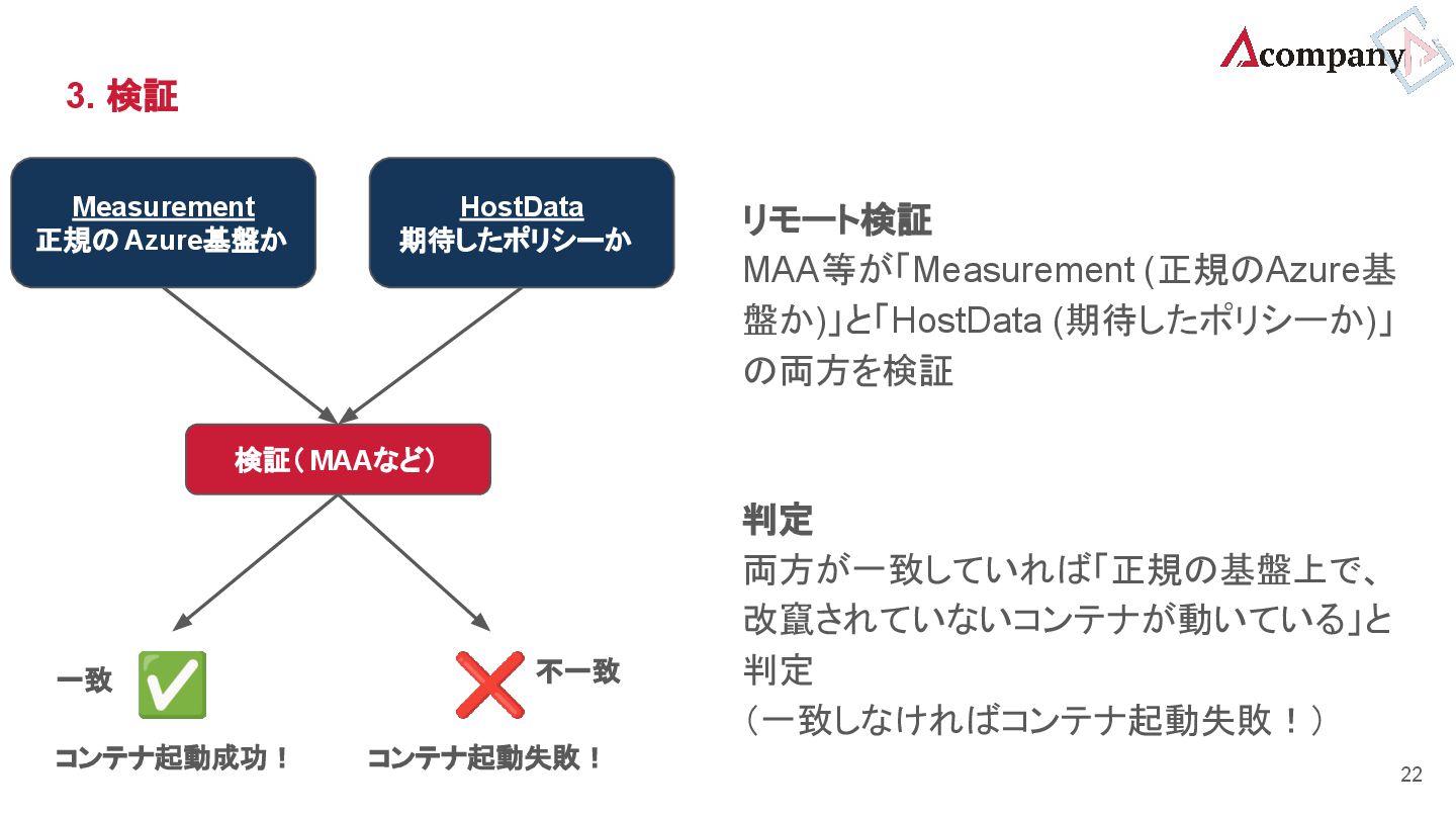 (一致しなければコンテナ起動失敗!) 3. 検証 検証(MAAなど) Measurement 正規のAzure基盤か HostData 期待したポリシーか ✅ ❌ コンテナ起動成功! コンテナ起動失敗! 一致 不一致 22