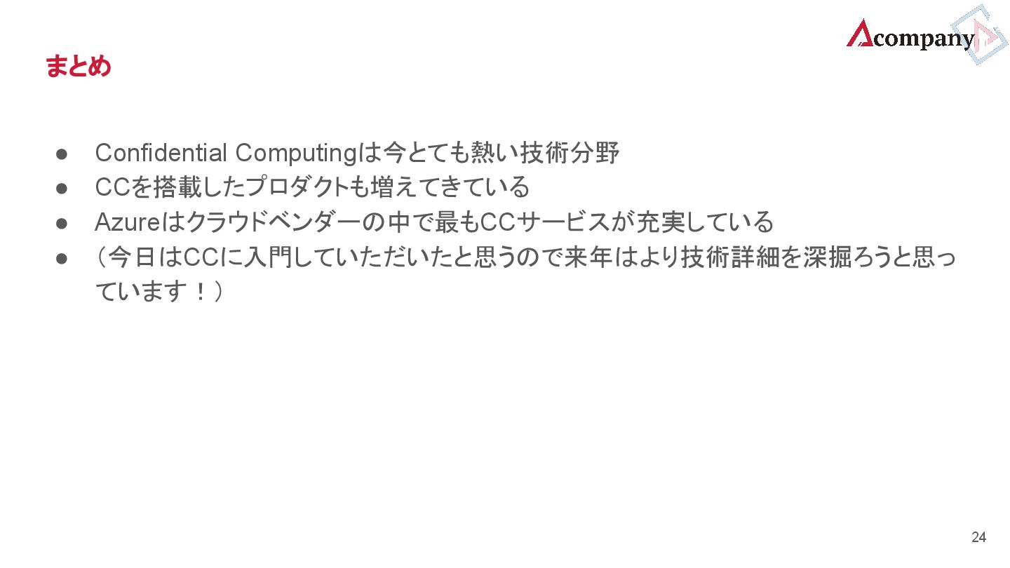 • Confidential Computingは今とても熱い技術分野 • CCを搭載したプロダクトも増えてきている • Azureはクラウドベンダーの中で最もCCサービスが充実している • (今日はCCに入門していただいたと思うので来年はより技術詳細を深掘ろうと思っ ています!)