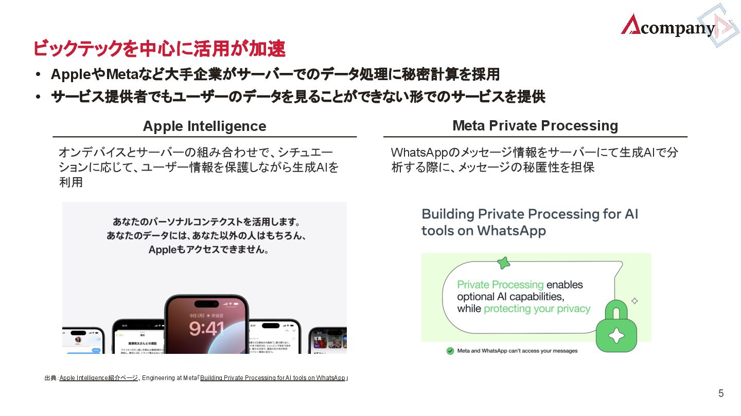 ビックテックを中心に活用が加速 • AppleやMetaなど大手企業がサーバーでのデータ処理に秘密計算を採用 • サービス提供者でもユーザーのデータを見ることができない形でのサービスを提供 Apple Intelligence オンデバイスとサーバーの組み合わせで、シチュエー ションに応じて、ユーザー情報を保護しながら生成AIを 利用