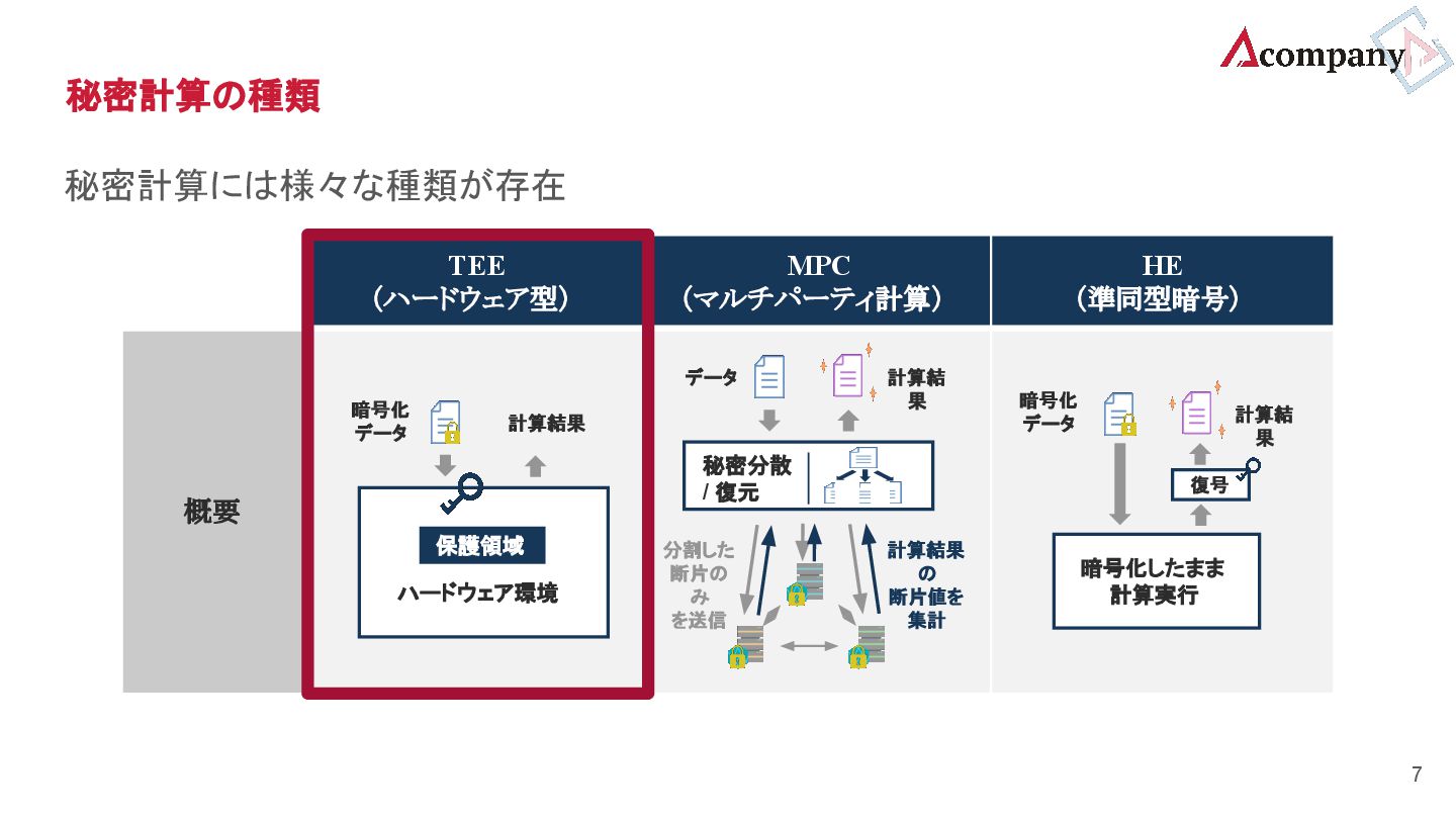 秘密計算には様々な種類が存在 TEE (ハードウェア型) MPC (マルチパーティ計算) HE (準同型暗号) 概要 計算結果 暗号化