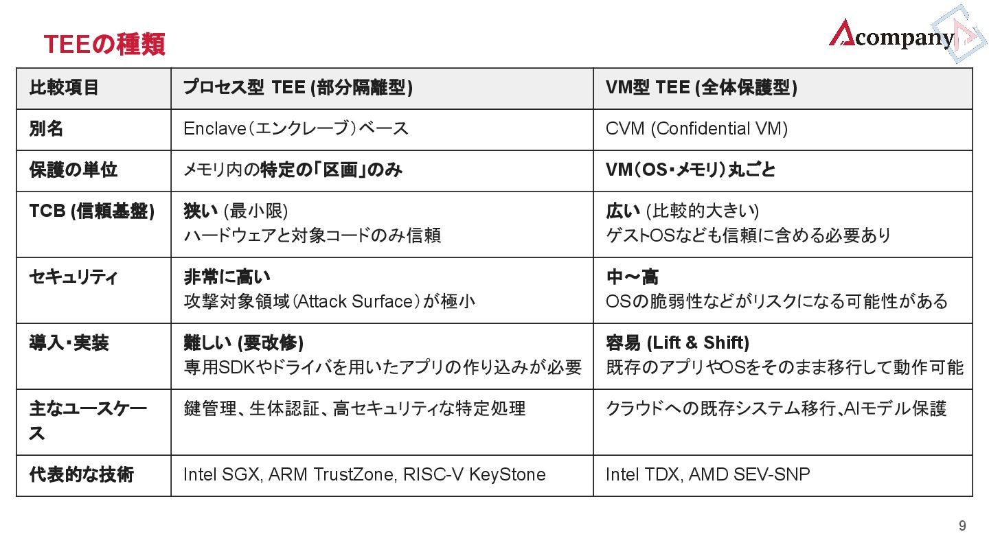 (Confidential VM) 保護の単位 メモリ内の特定の「区画」のみ VM(OS・メモリ)丸ごと TCB (信頼基盤) 狭い (最小限) ハードウェアと対象コードのみ信頼 広い (比較的大きい) ゲストOSなども信頼に含める必要あり セキュリティ 非常に高い 攻撃対象領域(Attack Surface)が極小 中〜高 OSの脆弱性などがリスクになる可能性がある 導入・実装 難しい (要改修) 専用SDKやドライバを用いたアプリの作り込みが必要 容易 (Lift & Shift) 既存のアプリやOSをそのまま移行して動作可能 主なユースケー ス 鍵管理、生体認証、高セキュリティな特定処理 クラウドへの既存システム移行、 AIモデル保護 代表的な技術 Intel SGX, ARM TrustZone, RISC-V KeyStone Intel TDX, AMD SEV-SNP TEEの種類 9