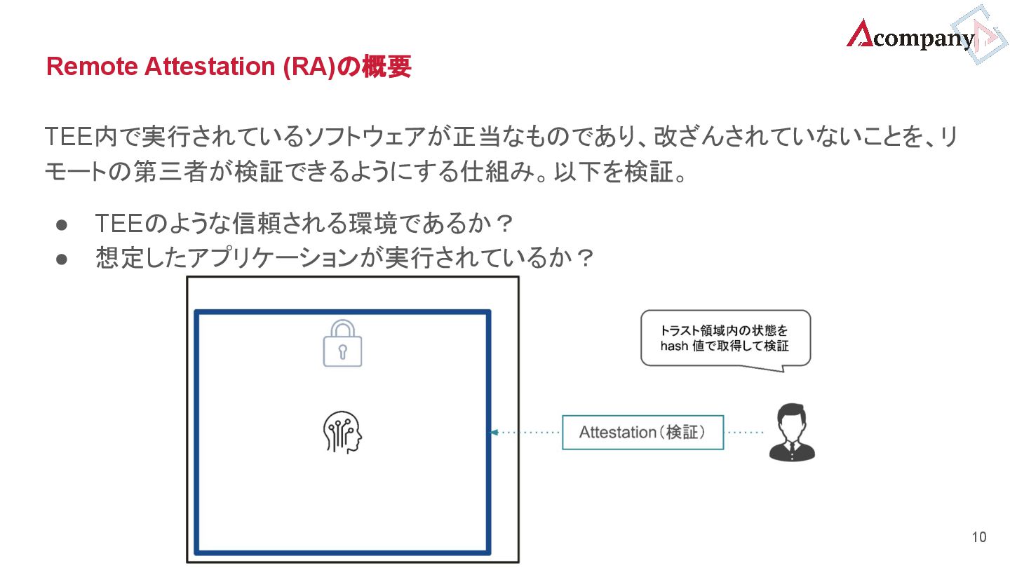 TEE内で実行されているソフトウェアが正当なものであり、改ざんされていないことを、リ モートの第三者が検証できるようにする仕組み。以下を検証。 • TEEのような信頼される環境であるか? • 想定したアプリケーションが実行されているか? Remote Attestation (RA)の概要 10