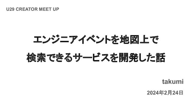 エンジニアイベントを地図上で 検索できるサービスを開発した話 takumi 2024年2月24日 U29 CREATOR MEET UP