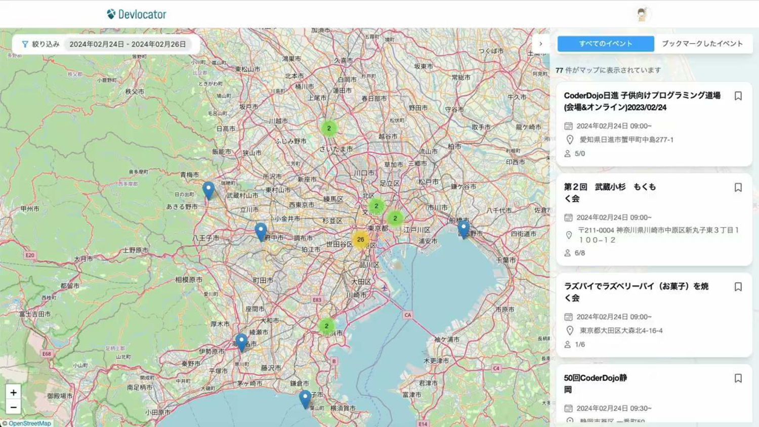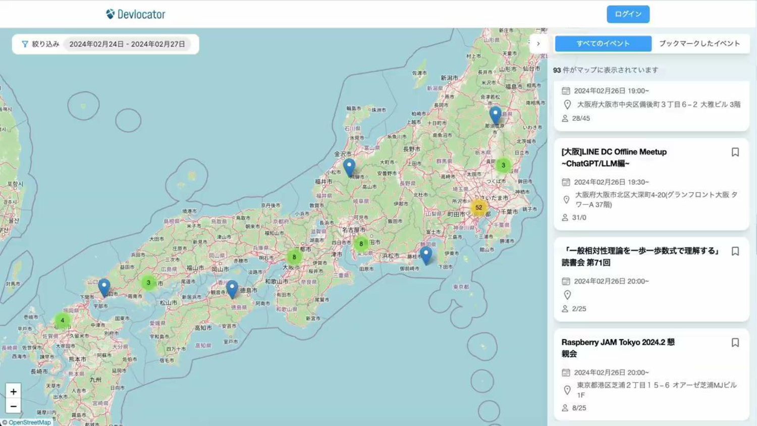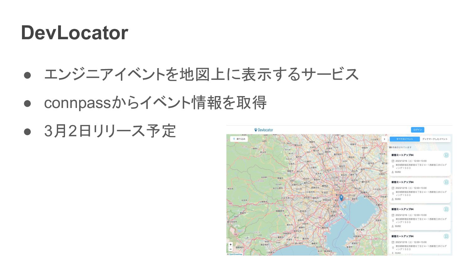 DevLocator • エンジニアイベントを地図上に表示するサービス • connpassからイベント情報を取得 • 3月2日リリース予定