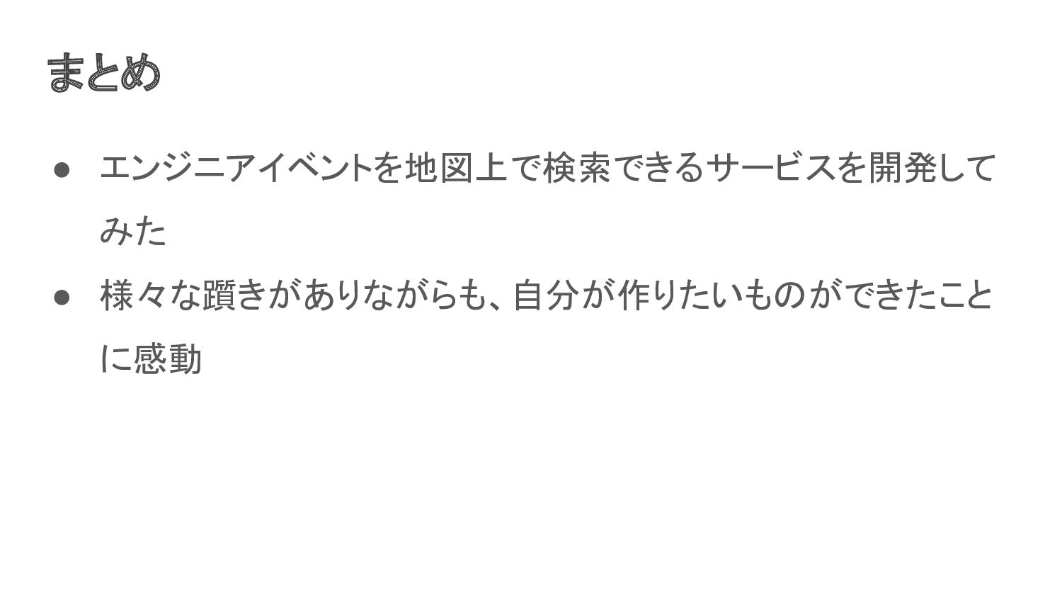 まとめ • エンジニアイベントを地図上で検索できるサービスを開発して みた • 様々な躓きがありながらも、自分が作りたいものができたこと に感動