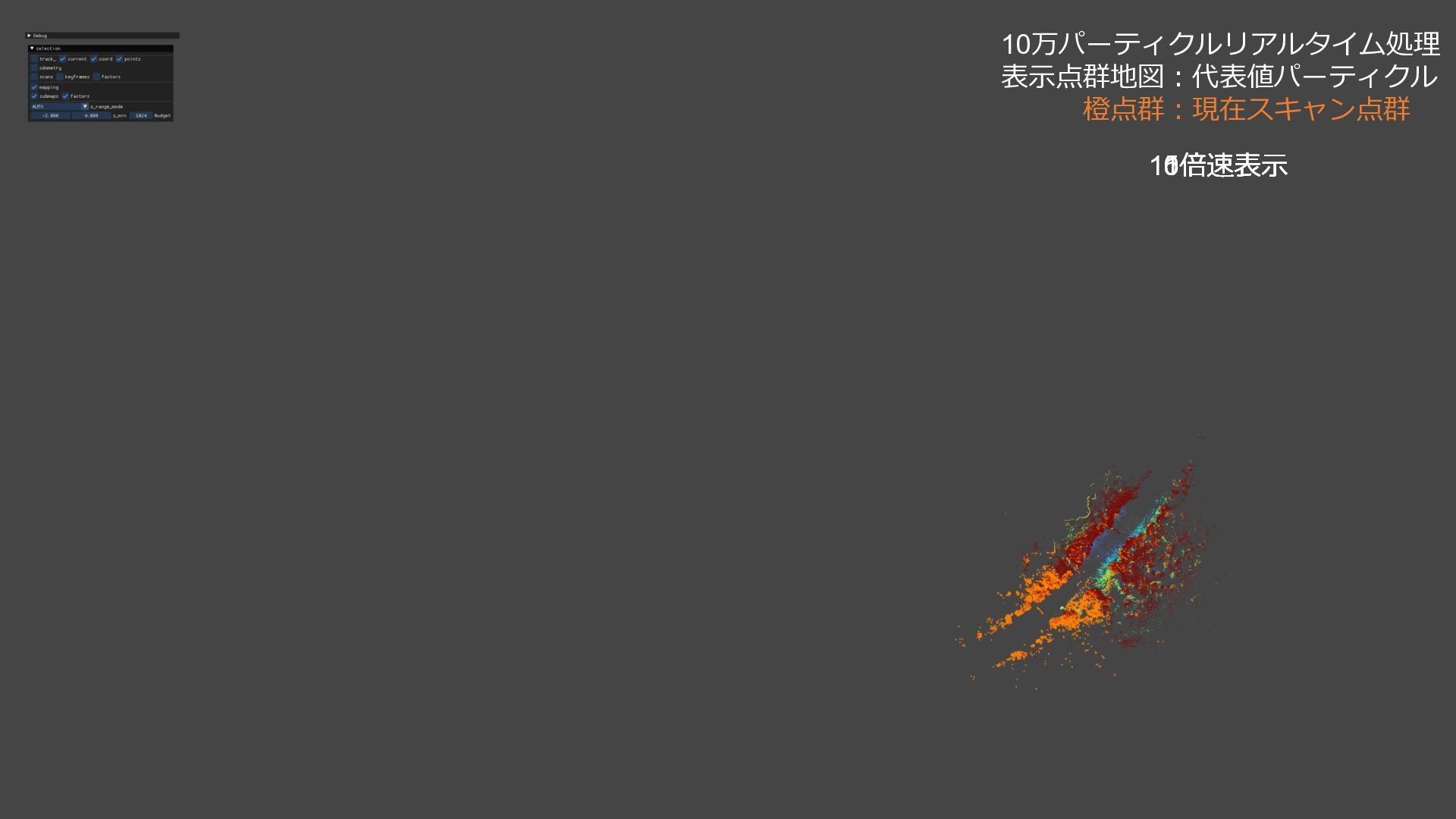1 10万パーティクルリアルタイム処理 表示点群地図:代表値パーティクル 橙点群:現在スキャン点群 10倍速表示 1倍速表示 10倍速表示 1倍速表示 5倍速表示