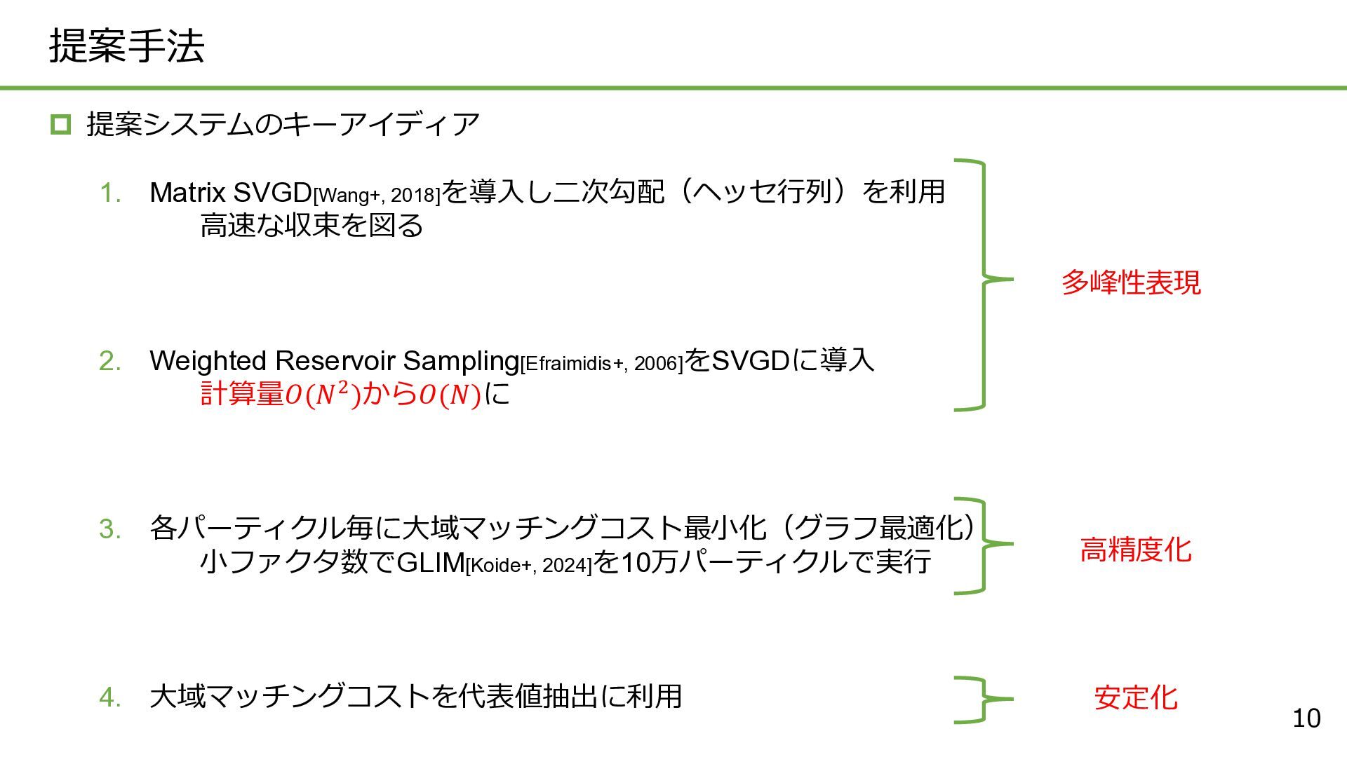 Weighted Reservoir Sampling[Efraimidis+, 2006] をSVGDに導入 計算量𝑂(𝑁2)から𝑂(𝑁)に 3. 各パーティクル毎に大域マッチングコスト最小化(グラフ最適化) 小ファクタ数でGLIM[Koide+, 2024] を10万パーティクルで実行 4. 大域マッチングコストを代表値抽出に利用 提案手法 多峰性表現 高精度化 安定化