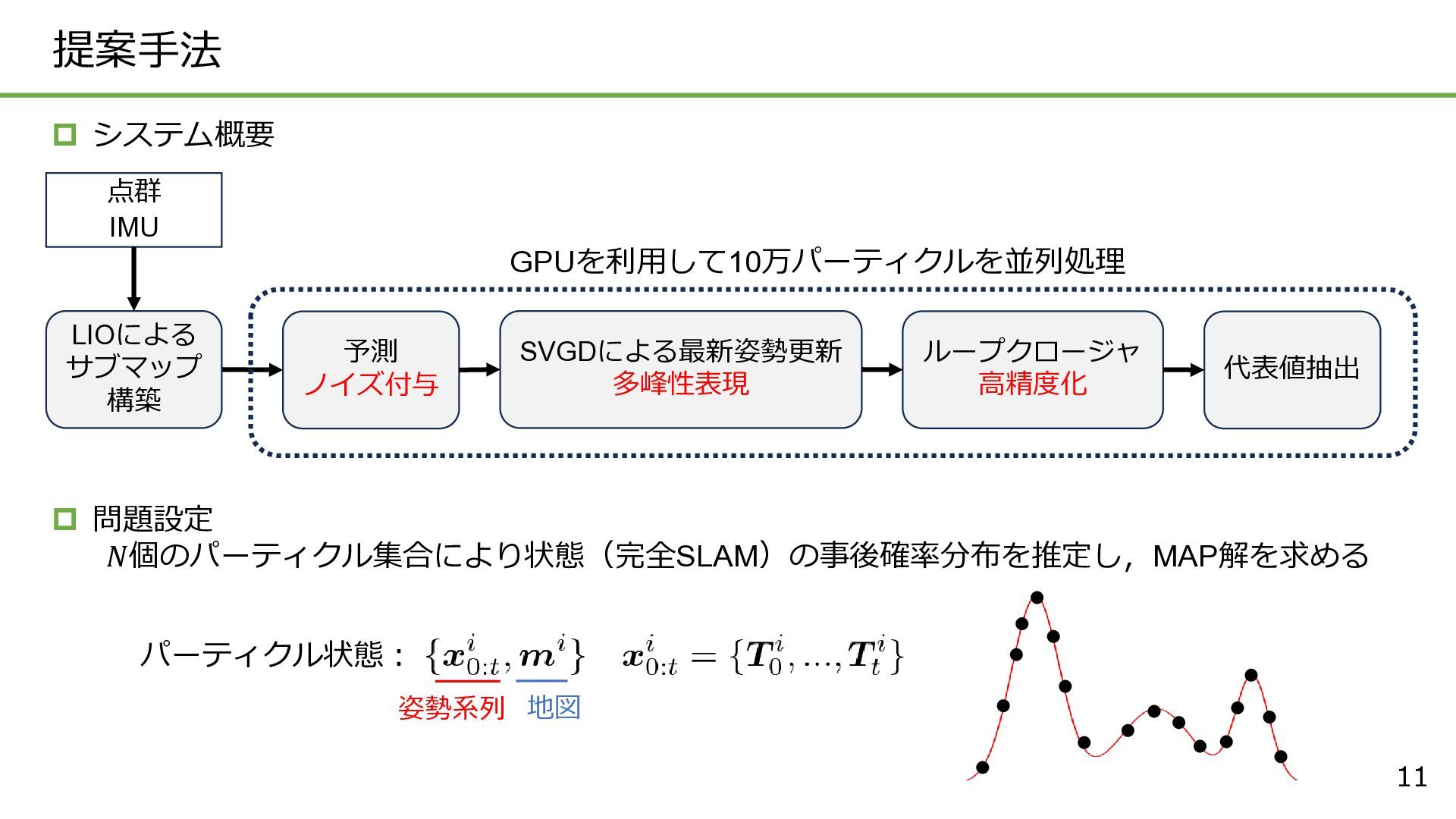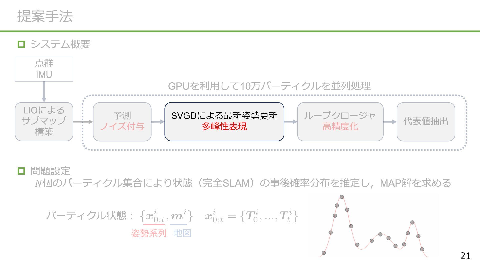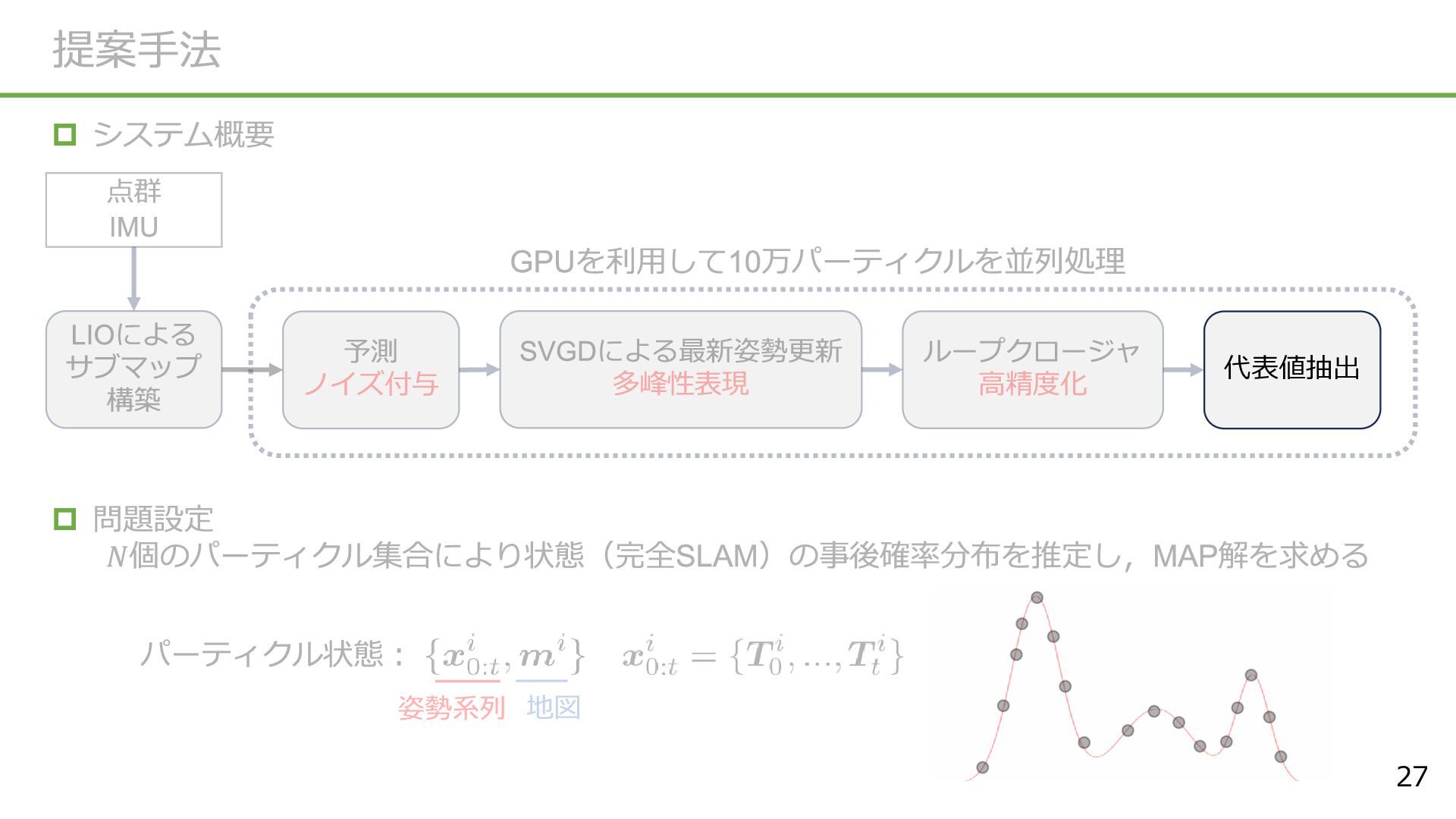 SVGDによる最新姿勢更新 多峰性表現 ループクロージャ 高精度化 GPUを利用して10万パーティクルを並列処理 問題設定 𝑁個のパーティクル集合により状態(完全SLAM)の事後確率分布を推定し,MAP解を求める パーティクル状態: 姿勢系列 地図 システム概要
