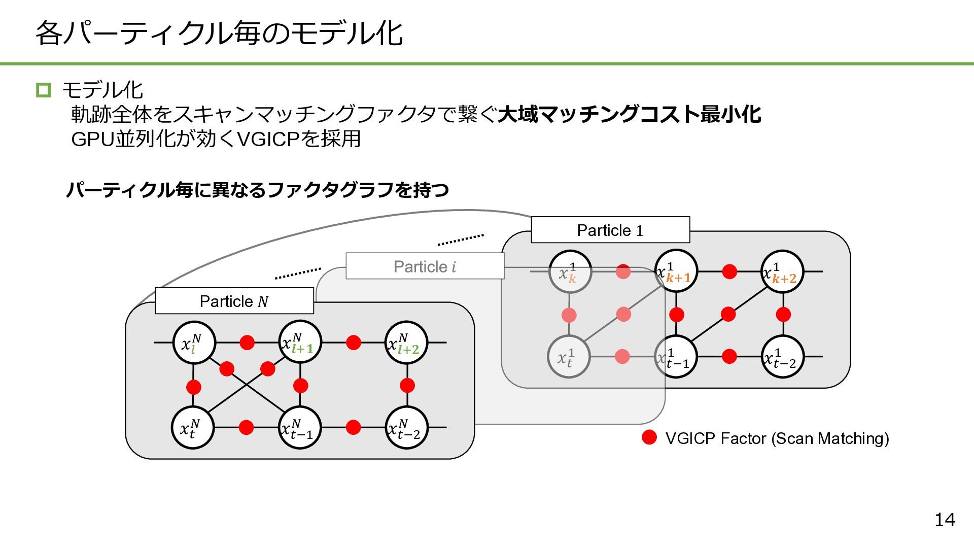 𝑥𝑡−2 1 𝑥𝑡 1 Particle 1 𝑥𝑙 𝑁 𝑥𝒍+𝟏 𝑁 𝑥𝒍+𝟐 𝑁 𝑥𝑡−1 𝑁 𝑥𝑡−2 𝑁 𝑥𝑡 𝑁 Particle 𝑁 VGICP Factor (Scan Matching) パーティクル毎に異なるファクタグラフを持つ モデル化 軌跡全体をスキャンマッチングファクタで繋ぐ大域マッチングコスト最小化 GPU並列化が効くVGICPを採用
