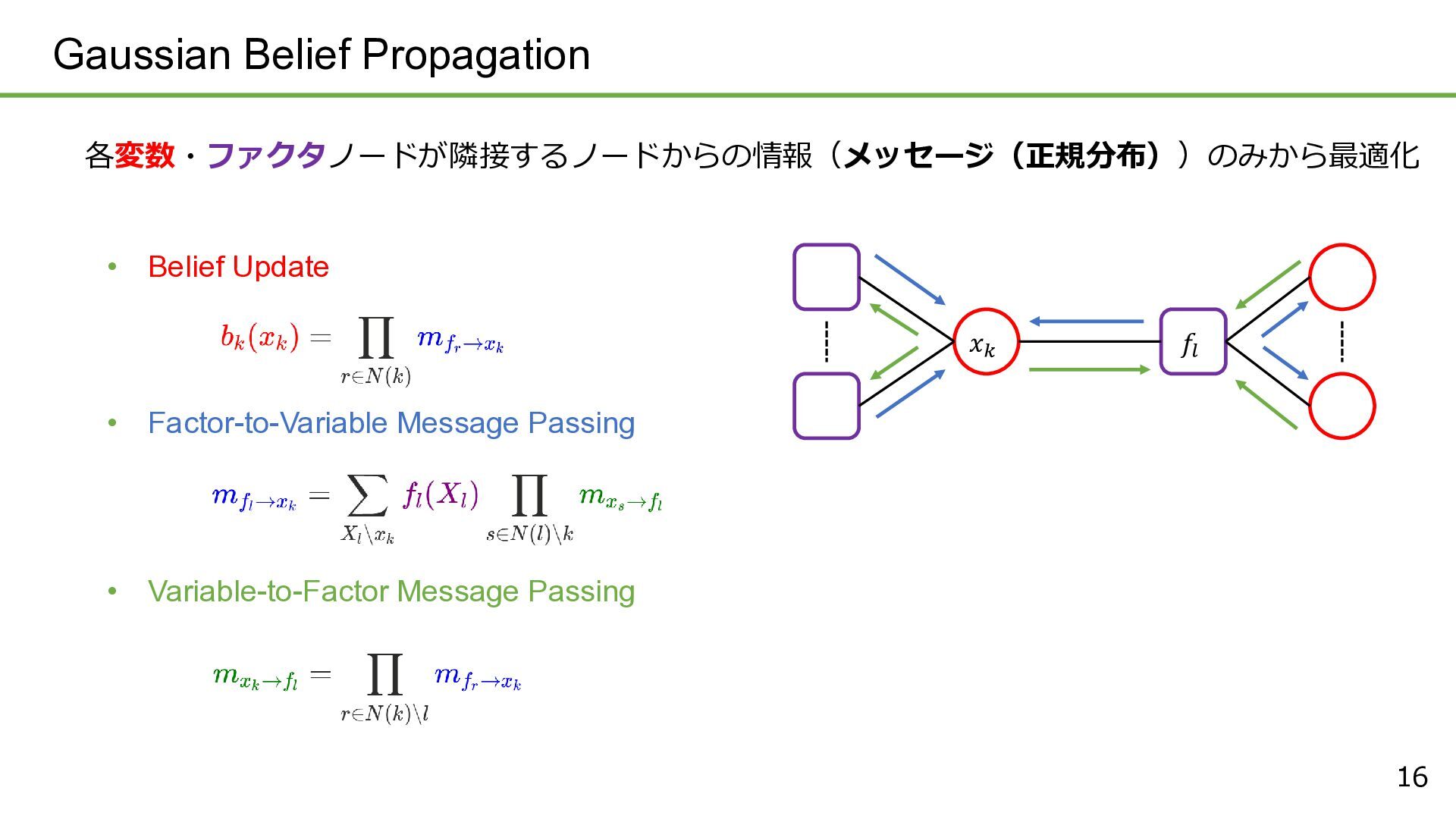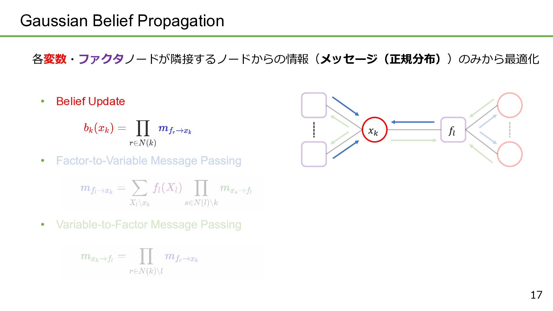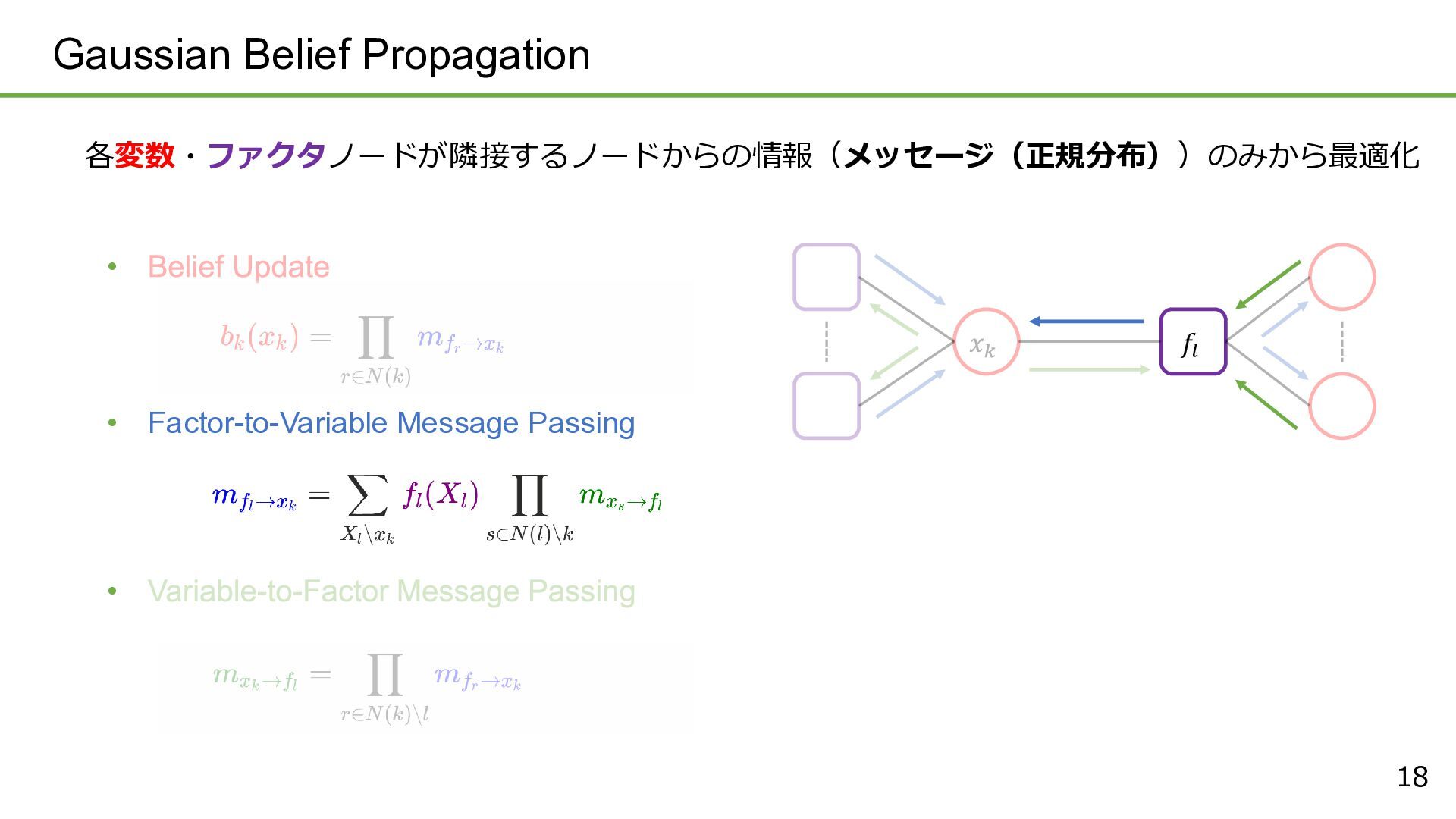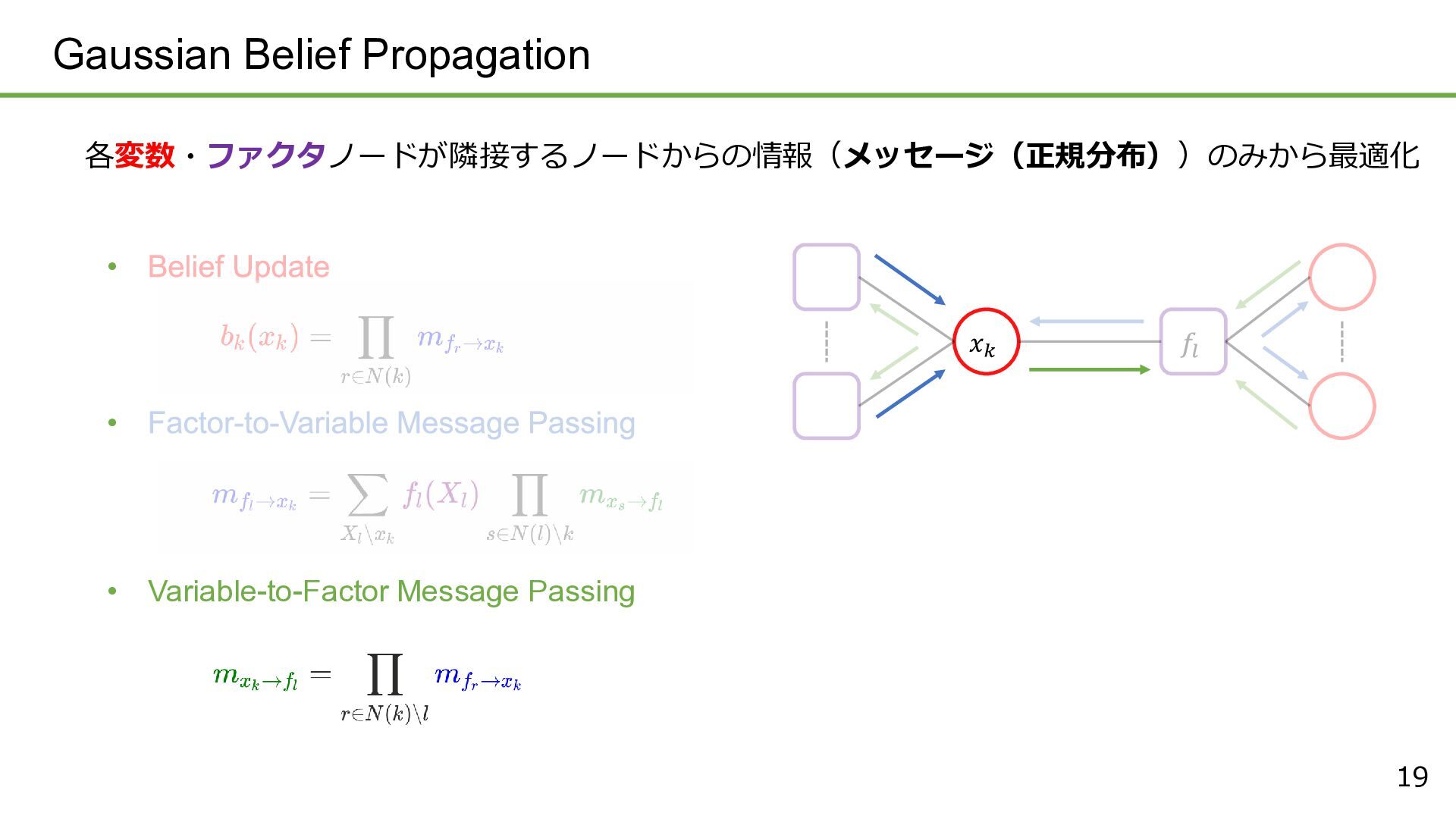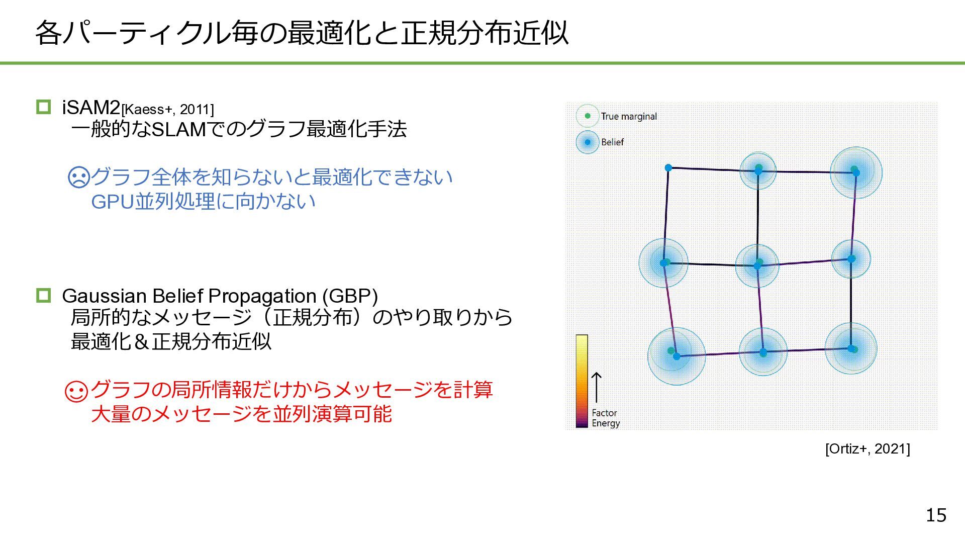 Belief Propagation (GBP) 局所的なメッセージ(正規分布)のやり取りから 最適化&正規分布近似 グラフの局所情報だけからメッセージを計算 大量のメッセージを並列演算可能 [Ortiz+, 2021]